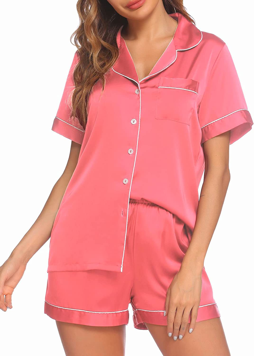 • Pajama Top:Short sleeve sleepwear with notch collar,button front pajamas shirt and one chest pocket design.Lightweight and Skin-friendly silk pajamas for women.Great for sleeping,casual wear or lounging around the house or yard all day