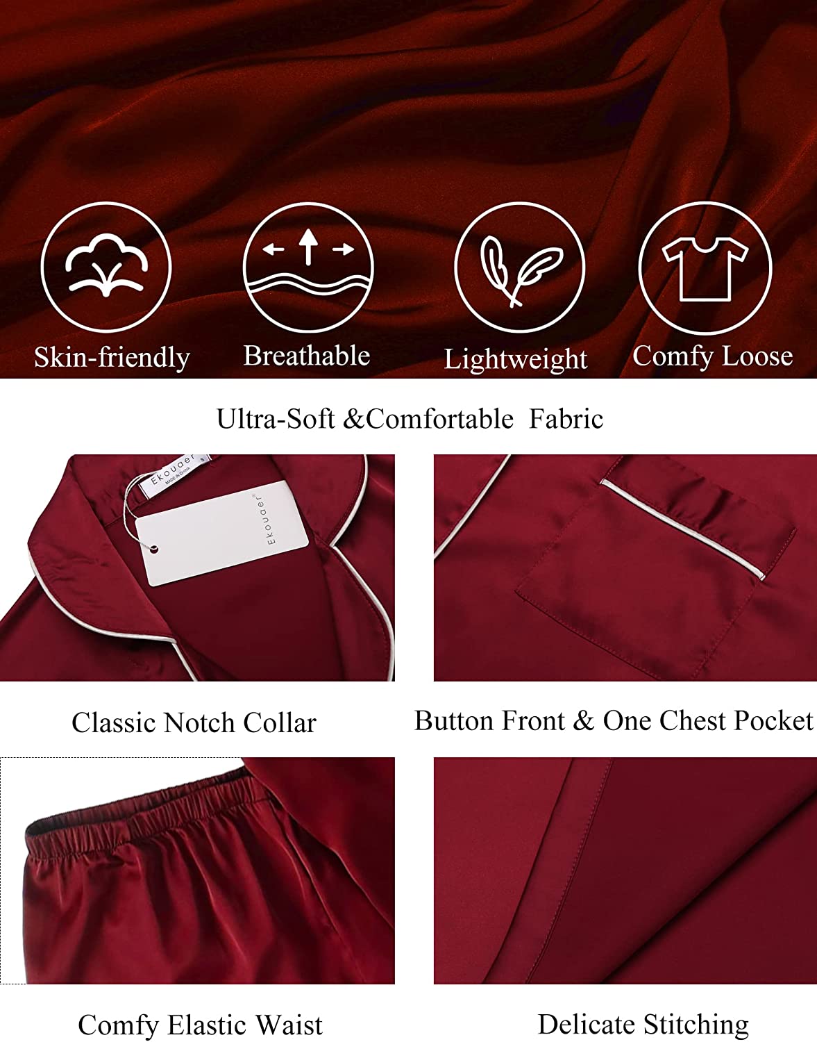 • Material:Satin pajama set is made of Premium 96%Polyester+4%Spandex satin fabric.Ultra Soft Silk Ekouaer Sleepwear.The fabric feel of style2 is slightly different