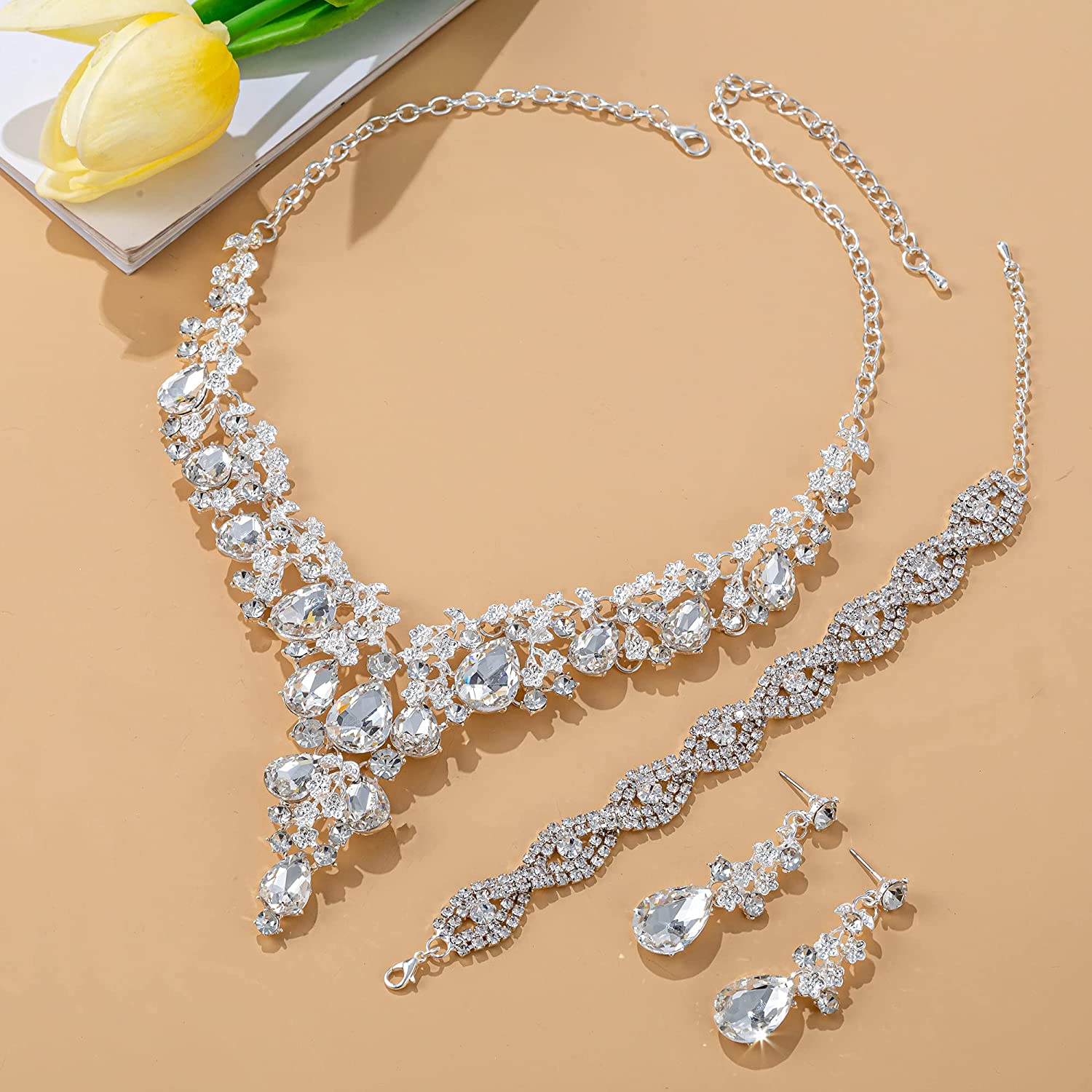 Paxuan Wedding Bridal Bridesmaid Austrian Crystal Rhinestone Jewelry Sets Statement Choker Necklace Drop Dangle Earrings Sets for Wedding Party Prom