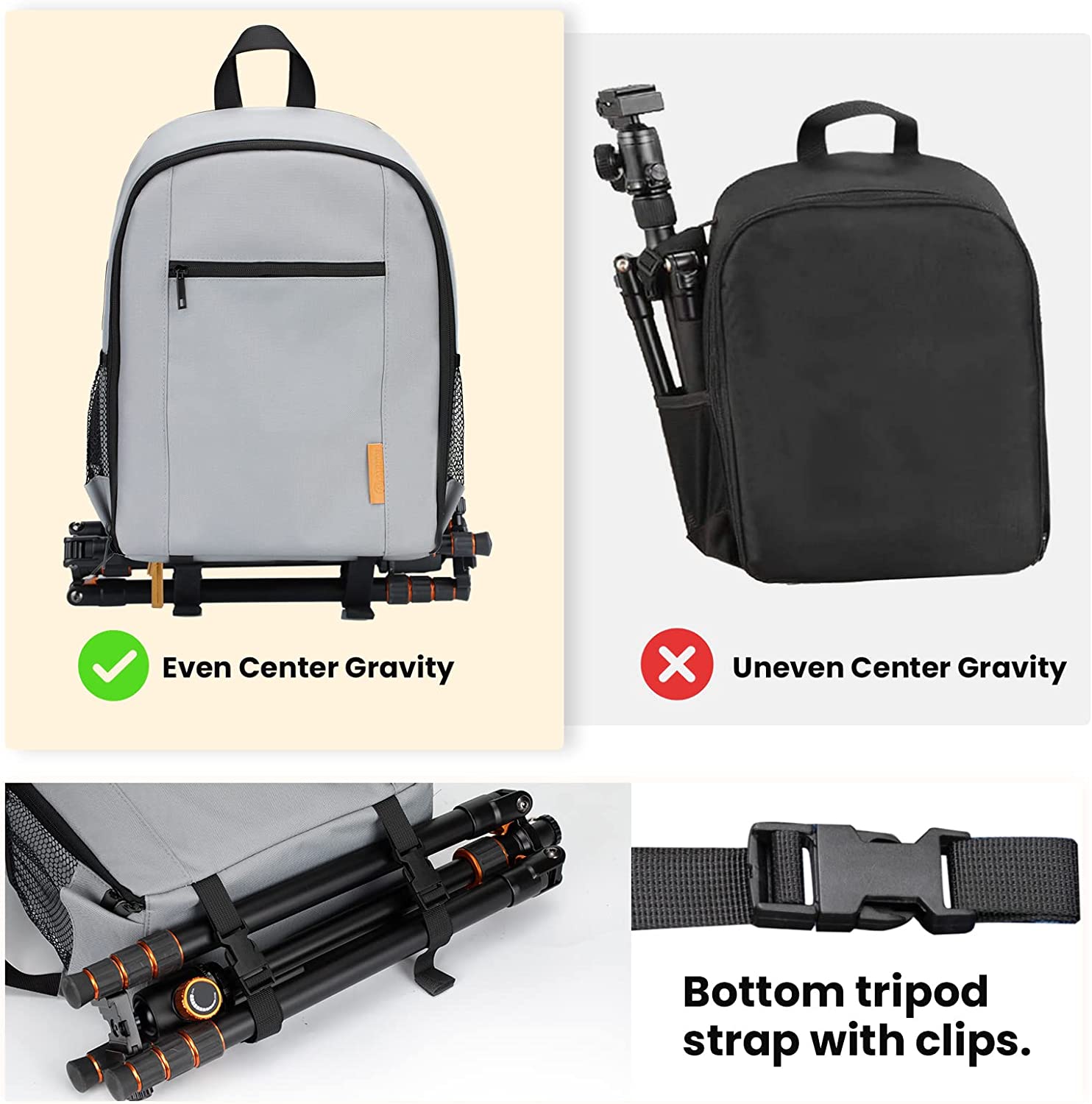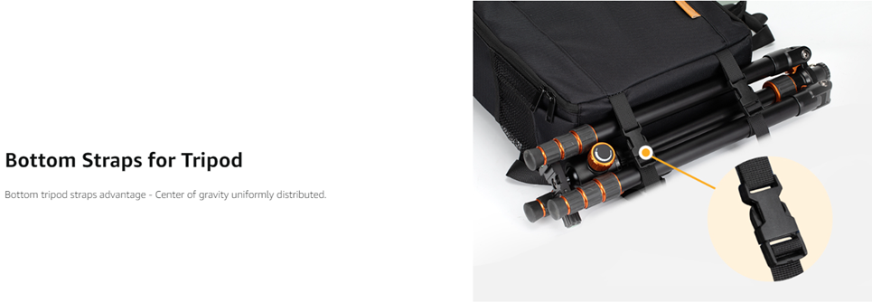 - 【BOTTOM TRIPOD STRAPS WITH CLIPS】Tripod or monopod can be attached to the bottom with straps which does not alter the center of gravity because the weight of both the tripod and the backpack are uniformly distributed, which aids comfort when carrying.