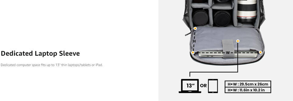 - 【COMPACT DESIGN BUT ENOUGH CAPACITY】 This camera and lens bag provides 7 rooms with 6 pieces padded removable dividers and 1 security strap which can hold 1 camera 6 lenses, while you can DIY the inner space by removing the thick dividers based on your equipment. Inside there is a dedicated sleeve for a 13" laptop or tablet/iPad. Bottom straps for tripod attachment. The front of the camera gear backpack has a zippered pocket for accessories. Mesh pockets on both sides for bottle and umbrella.
