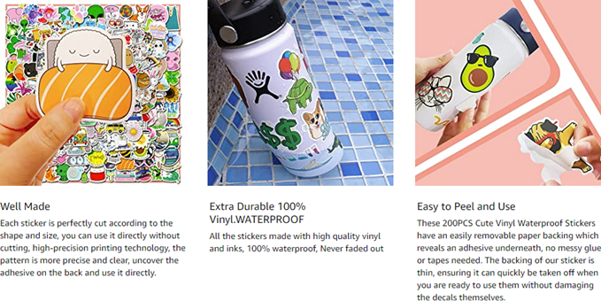 These Cute Vinyl Waterproof Stickers contain 200 pieces of different pattern vinyl stickers, Size range from 2.0 inches to 3.5 inches