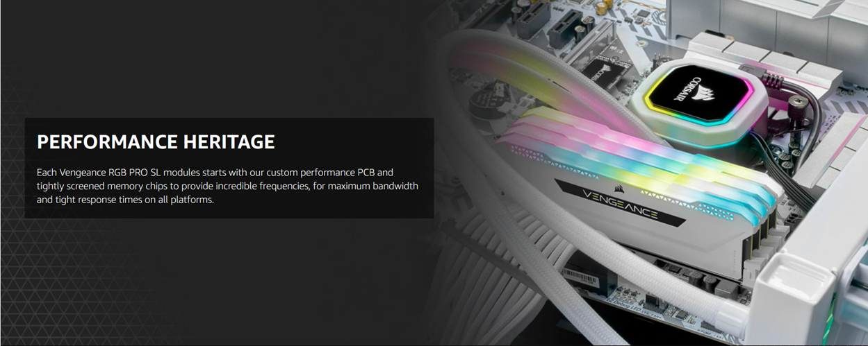 CORSAIR VENGEANCE RGB PRO SL DDR4 memory lights up your PC while delivering peak performance in a compact form factor just 44mm tall for wide compatibility with CPU coolers. Every module boasts ten bright, individually controlled RGB LEDs for brilliant illumination. Take control with CORSAIR iCUE software and completely customize every module’s lighting to match your system, create your own custom lighting profiles, and synchronize lighting across all your CORSAIR products. A custom PCB provides superb signal quality for superb performance and stability on the latest Intel® and AMD DDR4 motherboards, while tightly screened memory chips unlock superior overclocking ability. For mesmerizing, completely customizable RGB lighting and the best in DDR4 performance, equip your PC with VENGEANCE RGB PRO SL.