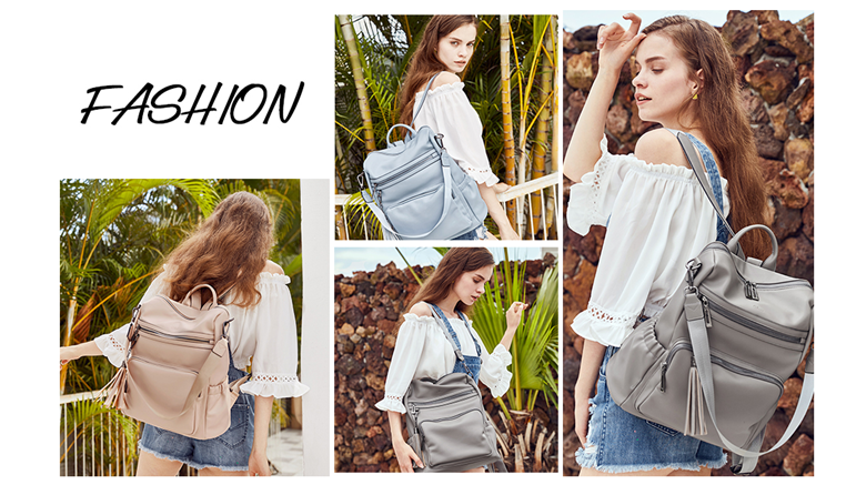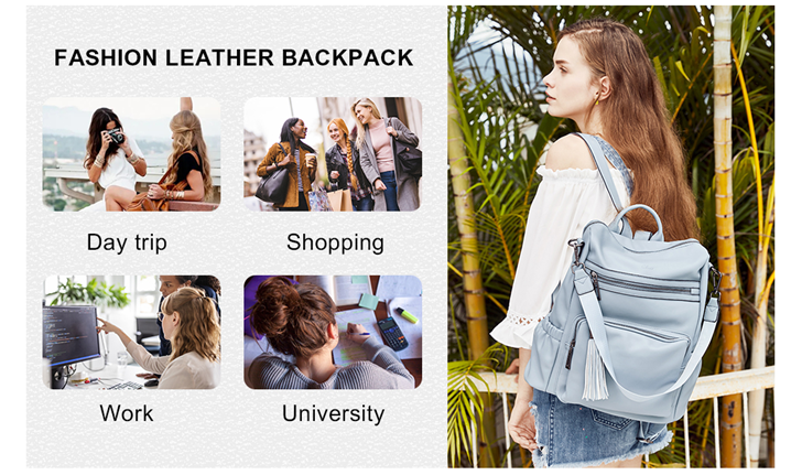 【VEGAN MATERIAL】: The pocket fashion leather backpack is Made of PU leather material with reinforced stitching, gun-tone hardware, soft fabric lining, delicate tassel designed for fashion appearance and adjustable canvas shoulder straps for convenience.