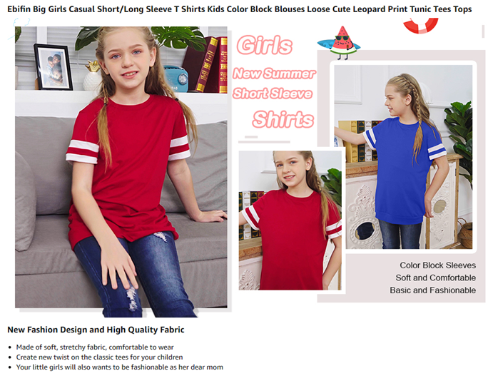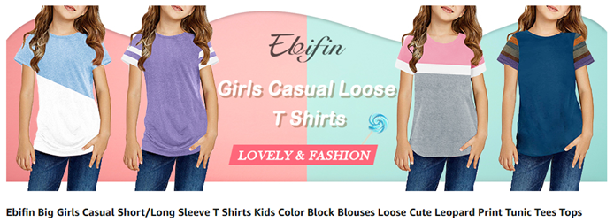 Ebifin Girls Casual Short/Long Sleeve T Shirts Kids Loose Soft Striped Color Block Tunic Tops, Tees Blouses Size 4-15 Years