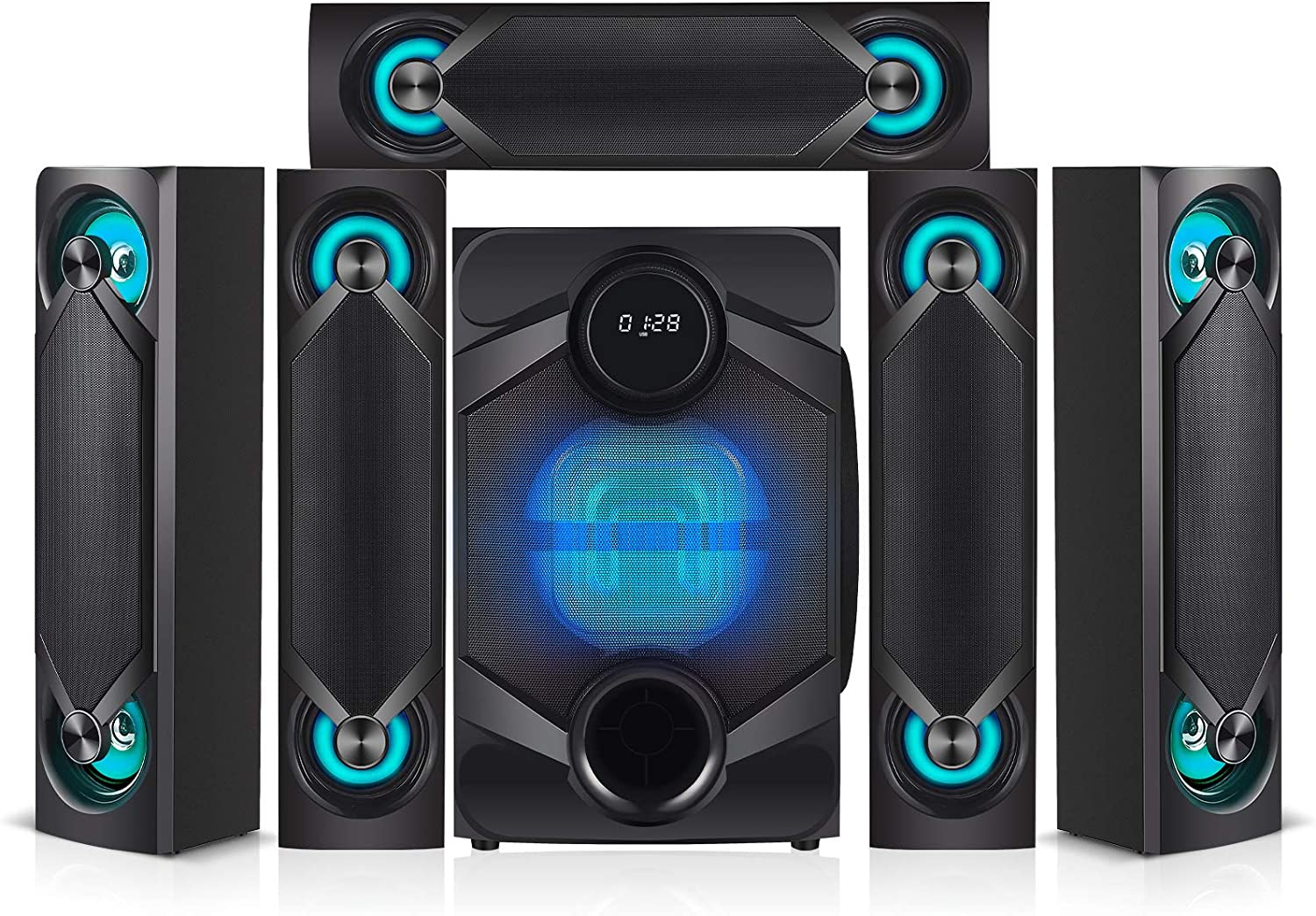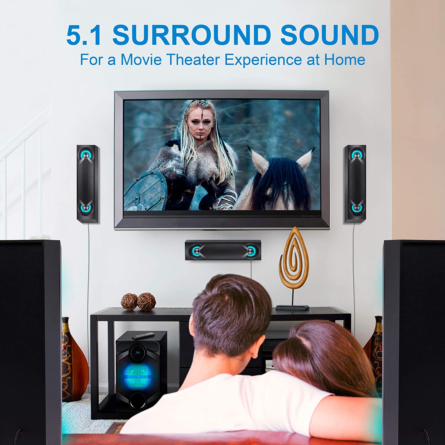 Nyne NHT5.1RGB 5.1 Channel Surround Sound Home Audio Theatre System – for TV, Bluetooth, LED, USB, SD, RCA Out in, 8 Inch Active Subwoofer, 6 Inch Passive Radiator, Soundbar, Cinema Acoustics