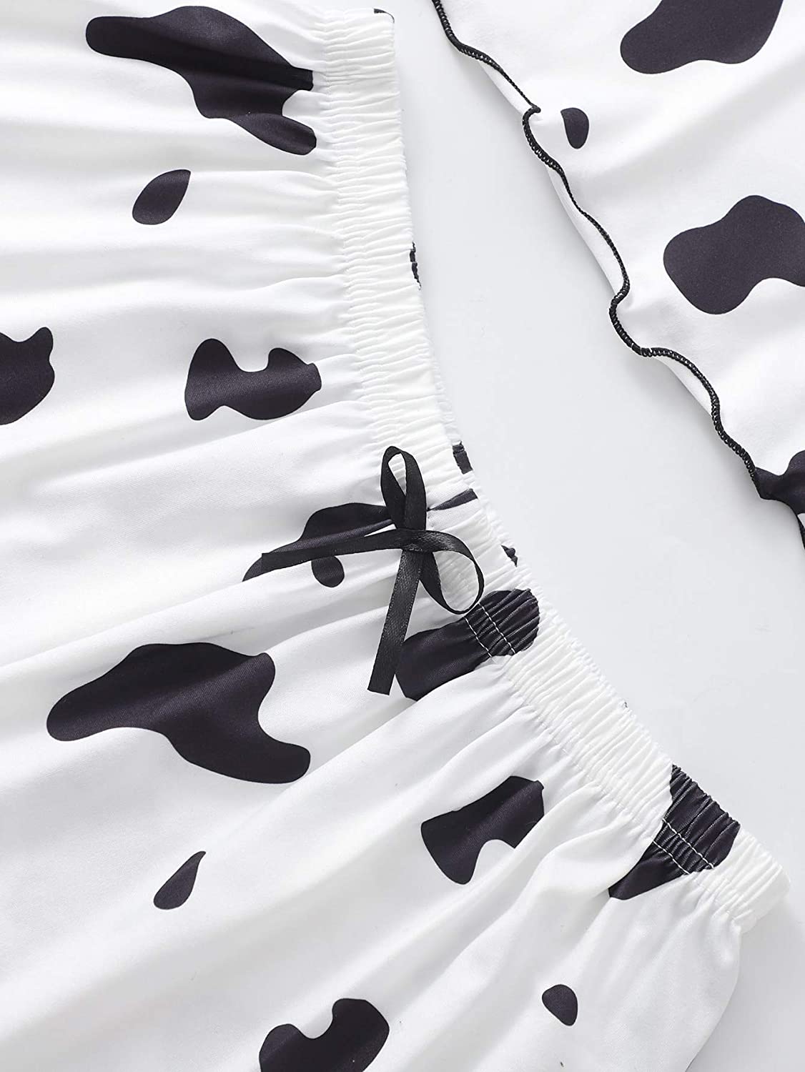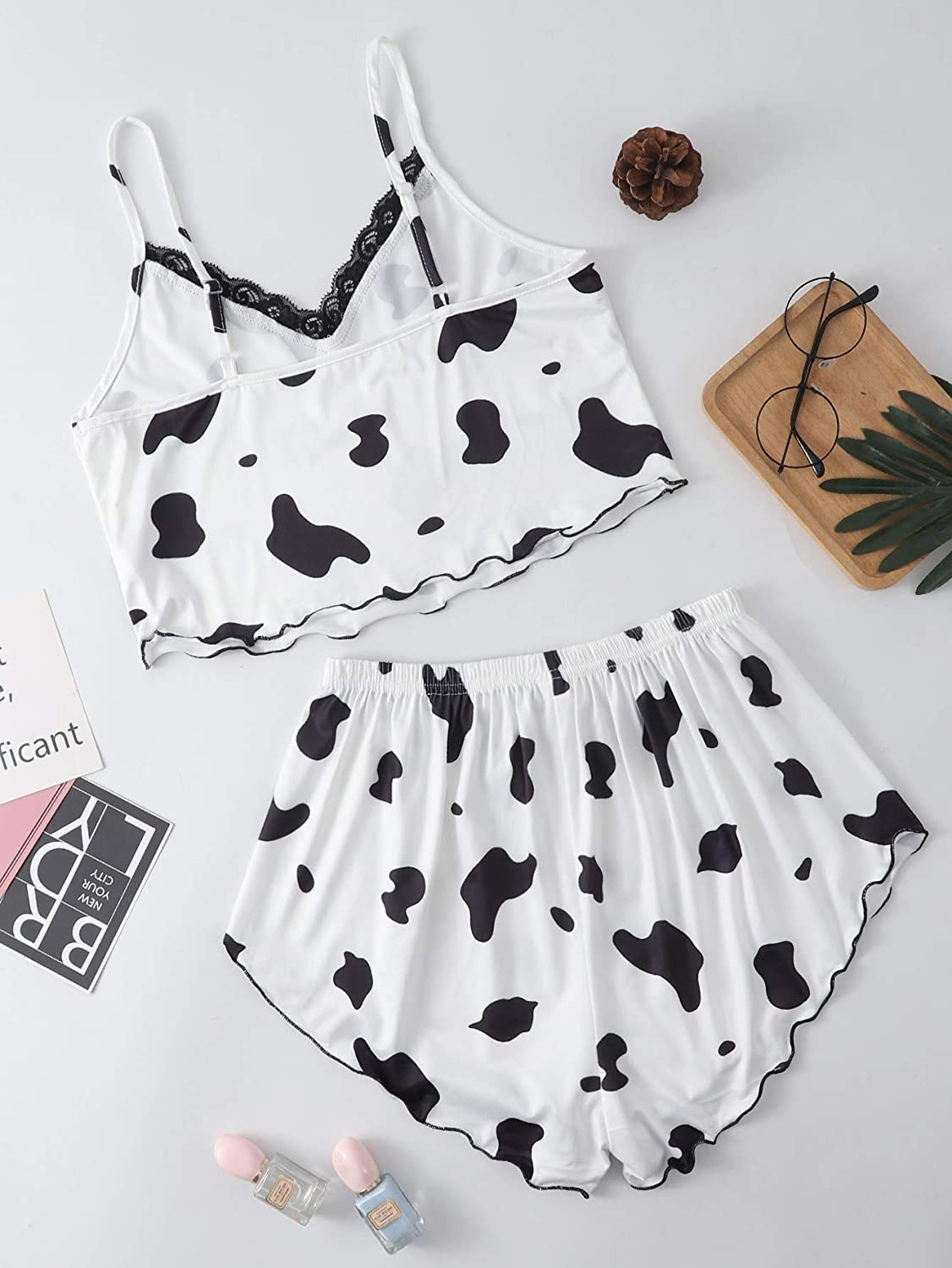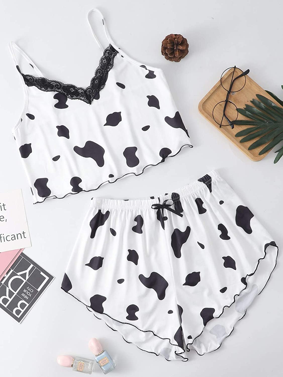 SheIn Women's Cow Print Sleepwear Lace Frill Trim Crop Cami Top and Shorts Pajama Set