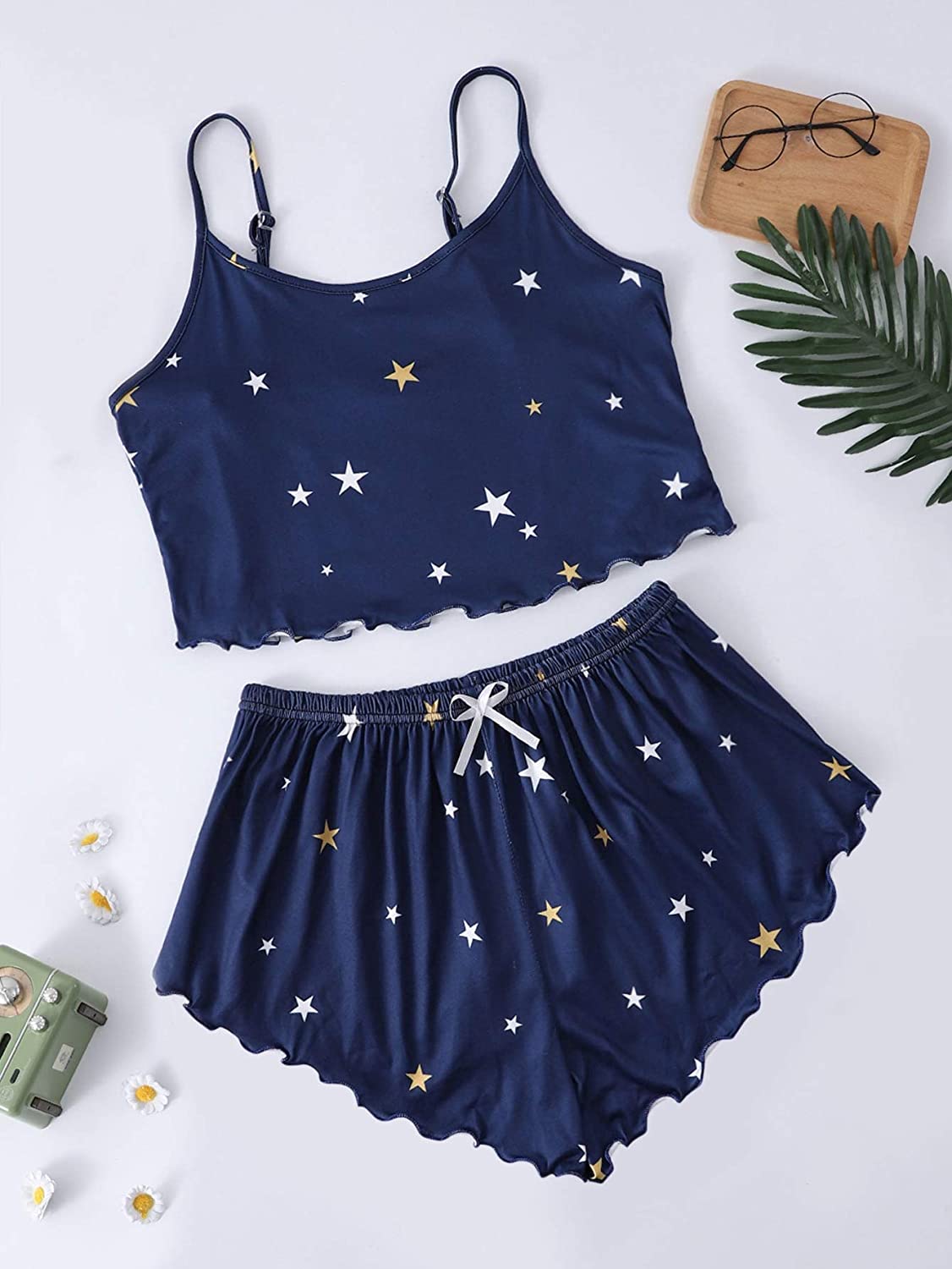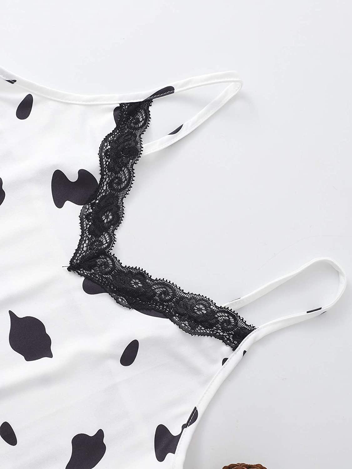 Top: Lace trim, frill hem, sleeveless, strappy, cute cow print pajama crop cami tops