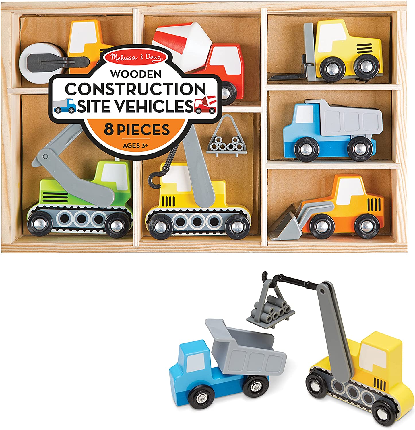 Melissa & Doug Wooden Construction Site Vehicles With Wooden Storage Tray (8 pcs) - Vehicle Toys, Cars For Toddlers And Kids Ages 3+