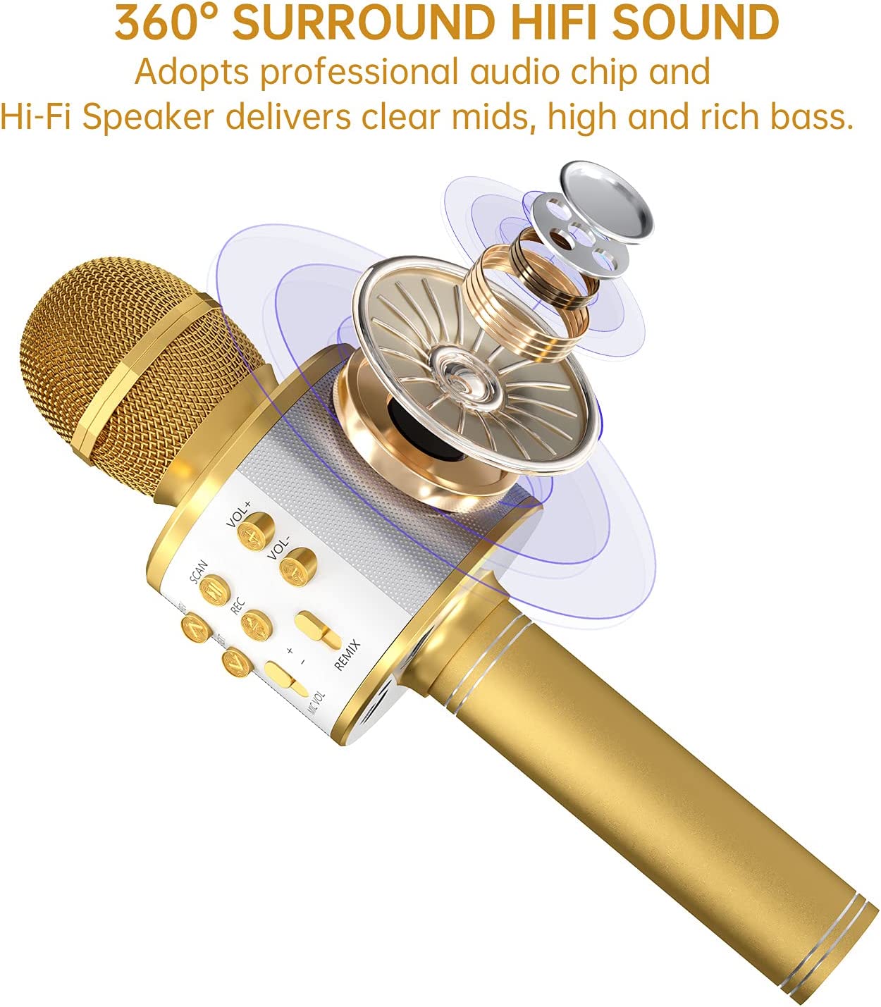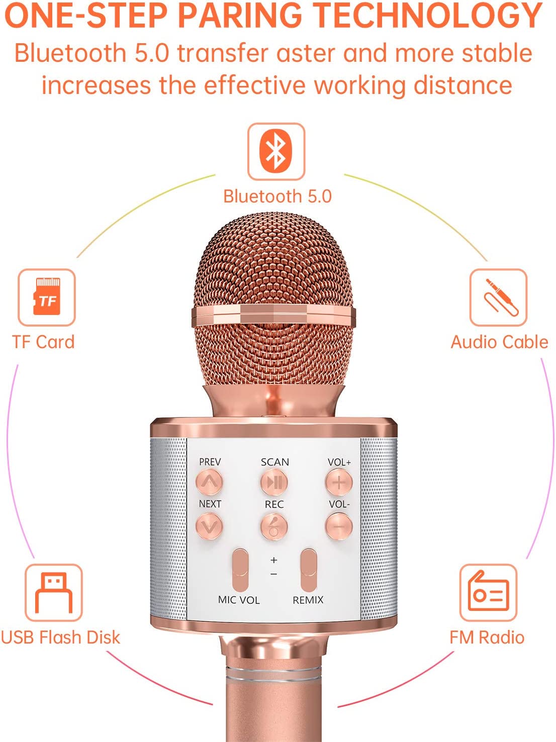 【Great Gifts】The karaoke microphone has a stylish appearance. With this microphone, everywhere is the stage. Let your kids start their little solo concert now. Say goodbye to wired microphone tangles and say hello to the freedom of movement! It is a great birthday or festival gift for your kids, friends, or family.