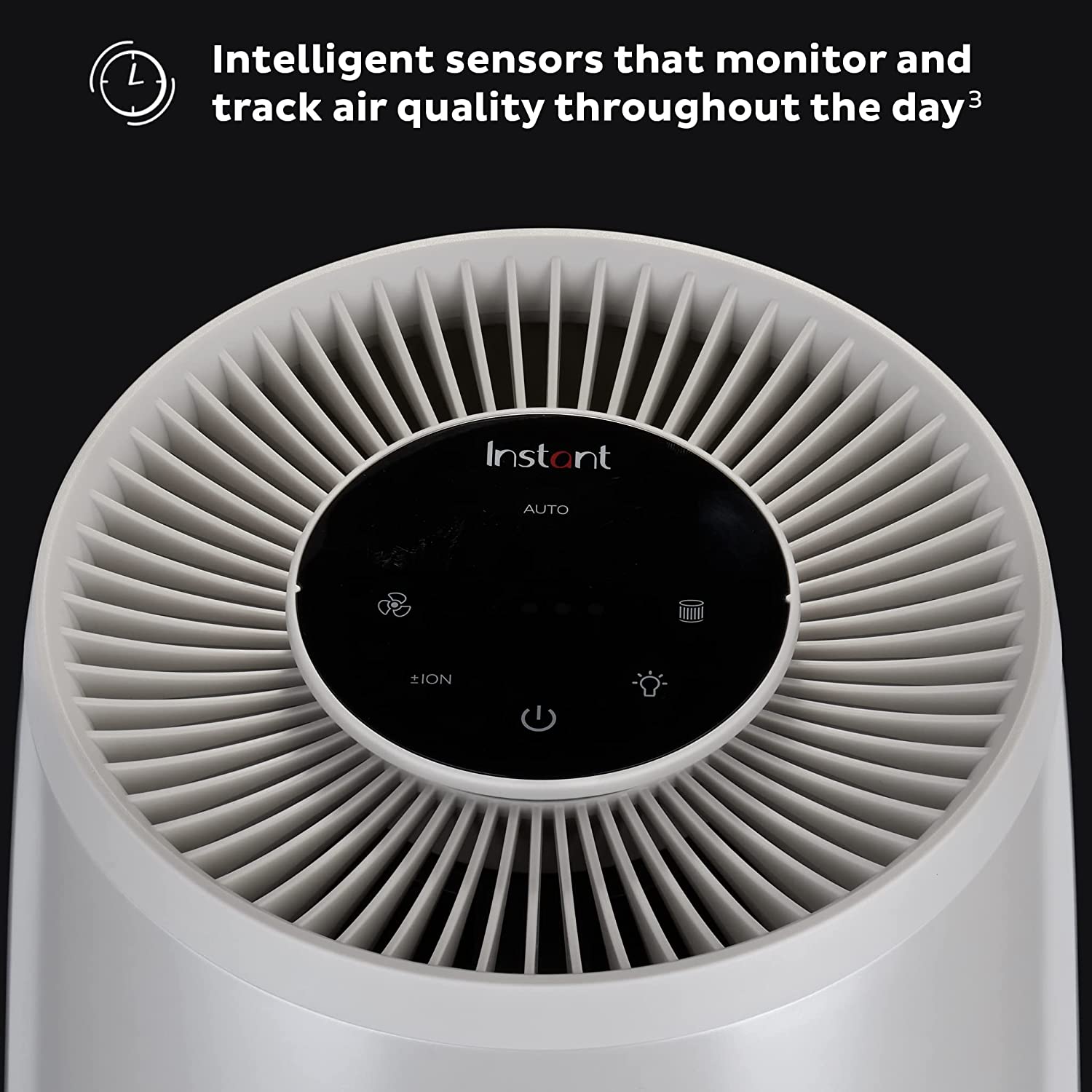 AUTO MODE: Automatically senses the air quality and adjusts the fan up or down according to detected quality. Light band indicates when air quality is good (white), okay (orange) or poor (red) and adjusts to get back to good.