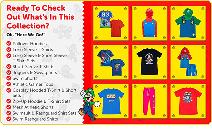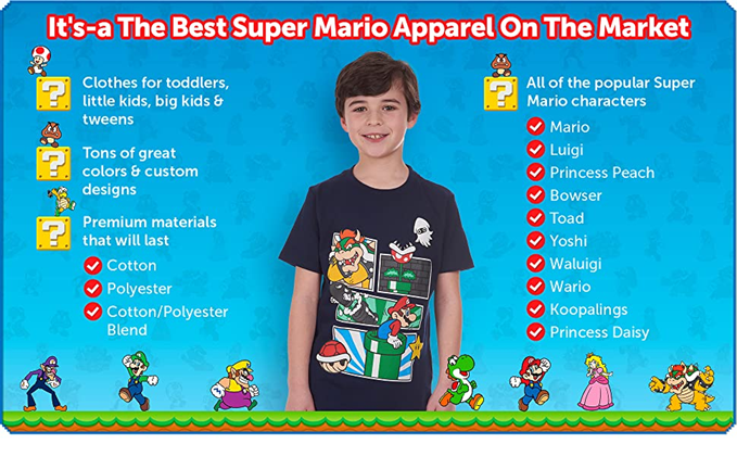 • SUPER MARIO BROS SHIRTS FOR KIDS: These 100% cotton shirts are perfect for any little boy who loves playing Nintendo games! The shirts come in multiple colors and designs, including cool prints featuring everyone's favorite character Mario.
