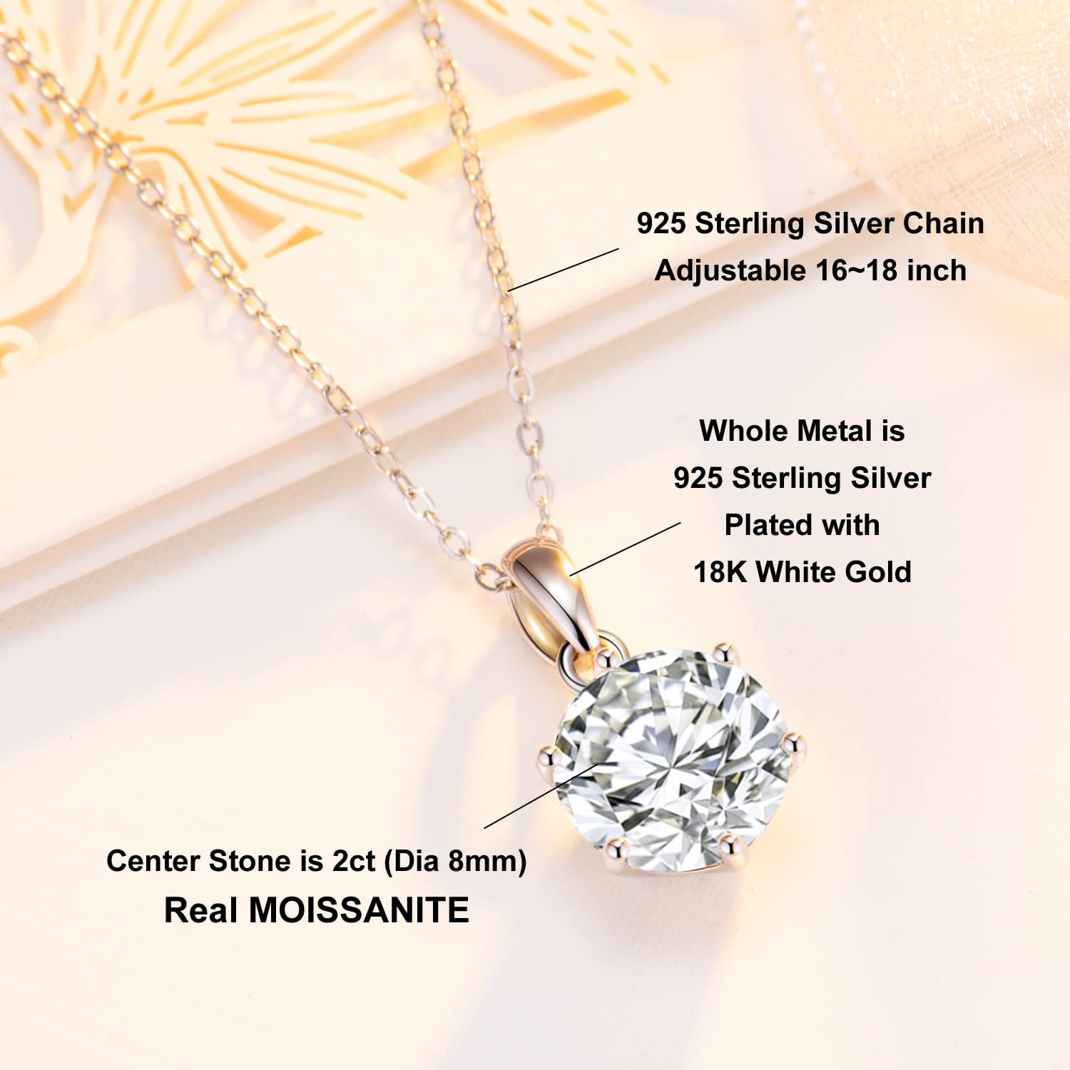 【TOP GRADE MOISSANITE】: This moissanite necklace for women with center stone 2ct (Dia 8 mm). D-E color grade make it looks clear, pendant setting metal is 18k white gold Over Sterling Silver. The stones feature hand made setting instead of wax setting, to ensure our stones are stronger and safer on the setting; On the other hand, the hand made setting will make the stones look more neat and will not uneven, to ensure a high-end outlook.