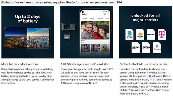 • Carrier compatibility: AT&T: 4G, VoLTE 5G support planned via MR, Verizon: 5G sub6 NSA, VoLTE, T Mobile: 5G sub6 SA/NSA, VoLTE, WiFi Calling, Video Calling, Tracfone: GSM, CDMA, Spectrum: 5G sub6 NSA, VoLTE, WiFi Calling. Does not support: U.S. Cellular, Republic Wireless, Xfinity Wireless. For all carrier compatibility details - please check the product images in detail.Form_factor : Smartphone touch screen.Display resolution maximum:50 pixels