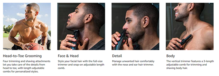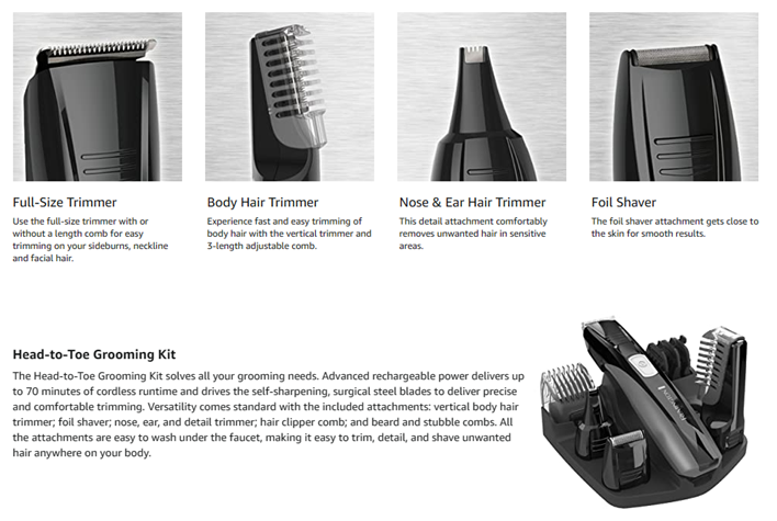 • 9 attachments for all your grooming needs: Full Size Trimmer; Foil Shaver; Nose, Ear, and Detail Trimmer; Vertical Body Hair Trimmer; Hair Clipper Comb with 8 Length Settings; 3 Beard and Stubble Combs