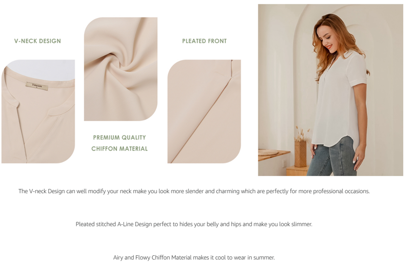 • These chiffon blouse for women have V-neck Design which are perfectly for more professional occasions such as business functions or elegant dinner parties. Pleated stitched A-Line Design creates a stylish swing flowing fit that makes you look slimmer while still feeling comfortable.