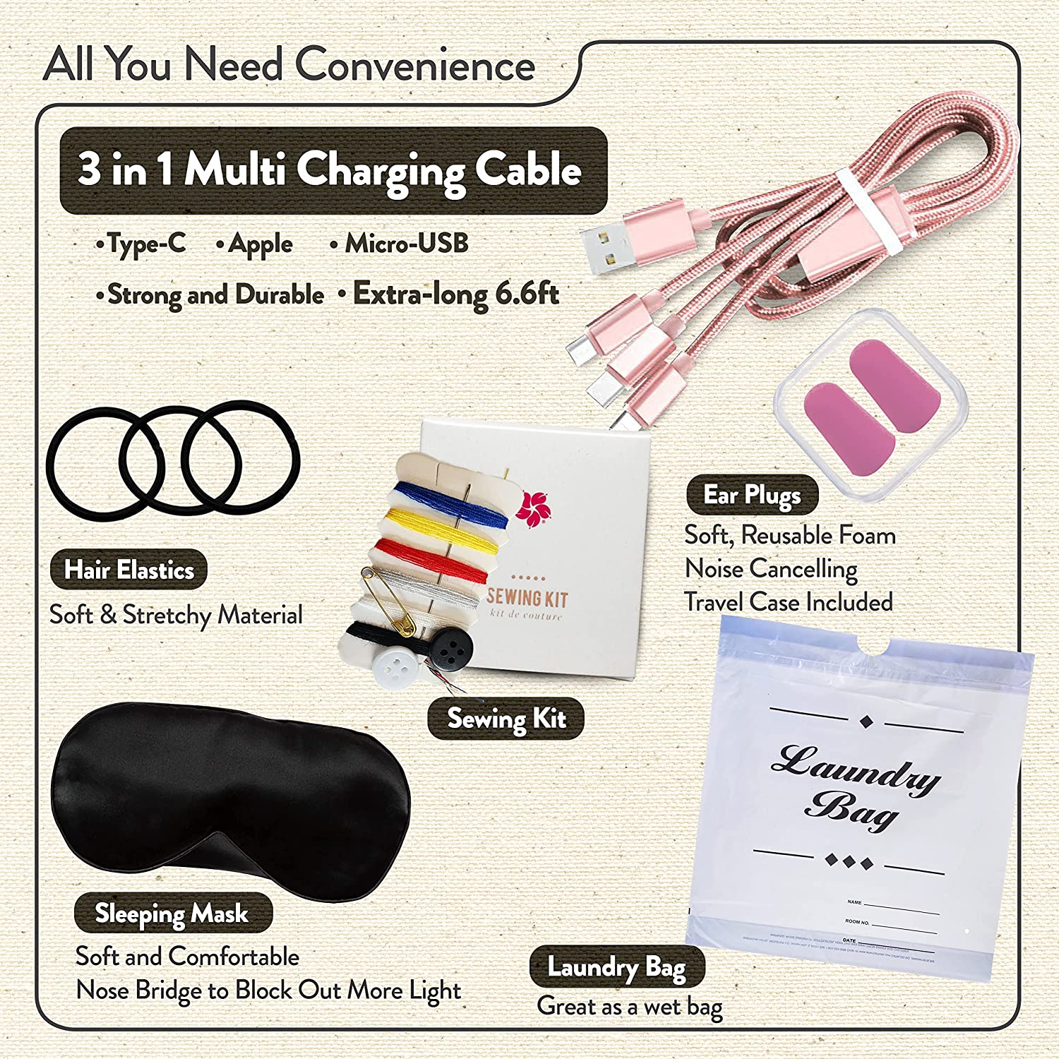 TSA COMPLIANT TRAVEL KIT INCLUDES: Large Capacity Toiletry Bag with Hanger, Extra Long (6.5 ft) Multi Phone Charger, Shampoo and Conditioner, Soap, Sponge, Body Lotion, Deodorant, Sleep Mask, Earplugs, Sanitizing Wipes, Bamboo Toothbrush, Toothpaste, Floss Picks, Makeup Remover Wipes, Laundry Bag, Sewing Kit, Cotton Pads, Q-tips, Nail File. Travel essentials and Travel-Size Toiletries for grooming, hygiene, oral care and comfort for women.