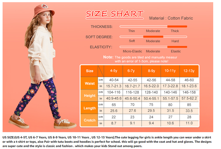 【RECOMMENDED SIZE】: These girls' leggings are available in ages 4-12, so you can easily choose the girl leggings that fit your child, (Size 4-5T,Size 6-7 Years,Size 8-9 Years,Size 10-11 Years, Size12-13 Years) girls active leggings:The designs are super cute and the style is trend and fashionable. which makes your kids stand out among peers.
