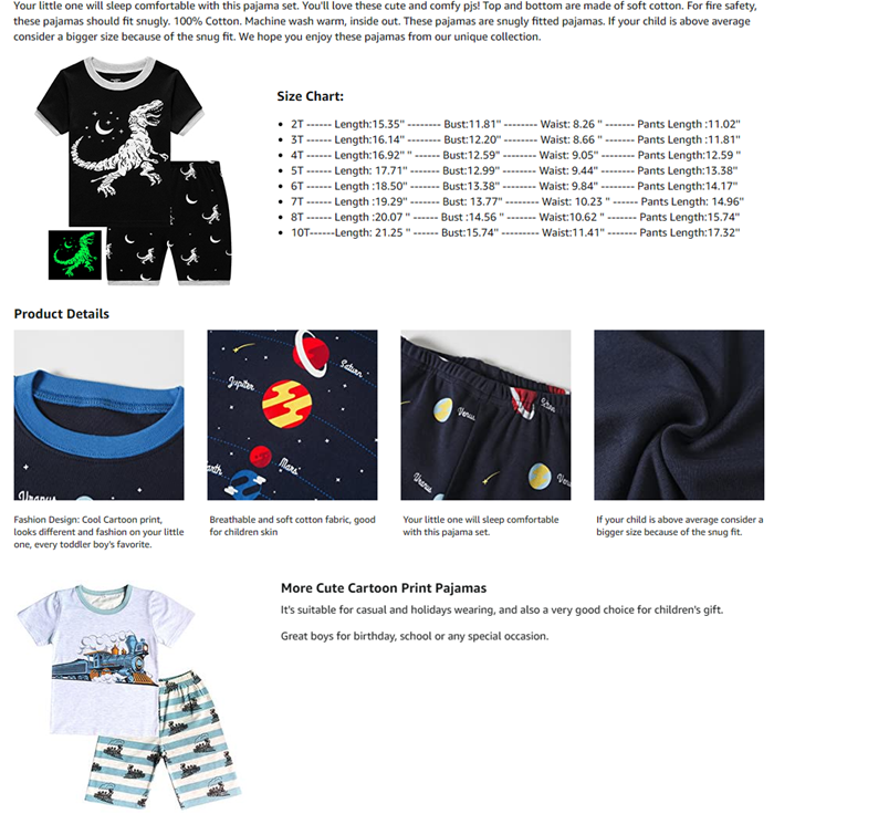 • The boys pajamas suited to 2-10 years old boys. If your boys is stronger or taller than average, recommend one or two bigger size because of the snug fit,good air permeability and soft hand feeling.