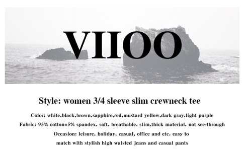 VIIOO Women's Basic 3/4 Sleeve Crew Neck T-Shirt Casual Solid Slim Cotton Top