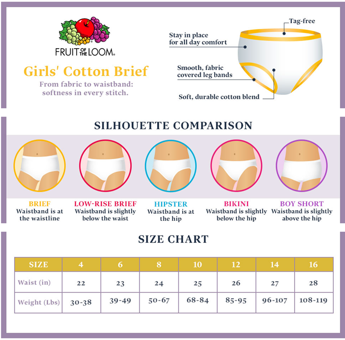Introducing our improved cotton with extra softness, Fruit of the Loom girls' 14 pack brief is an essential addition to her collection with this value pack size. This brief is designed with breathable, 100% cotton fabric, a plush, ravel-free waistband, and soft, fabric-covered legs. The waistband sits just below the belly button and has a lower cut leg for a more classic fit with mom approved coverage. This assortment includes fun prints and fashionable solids that are sure to become her new favorites. As always, our Fruit of the Loom panties are tag free and have a 100% cotton liner for extra softness. These briefs are not only cute, but the ultimate in comfort!