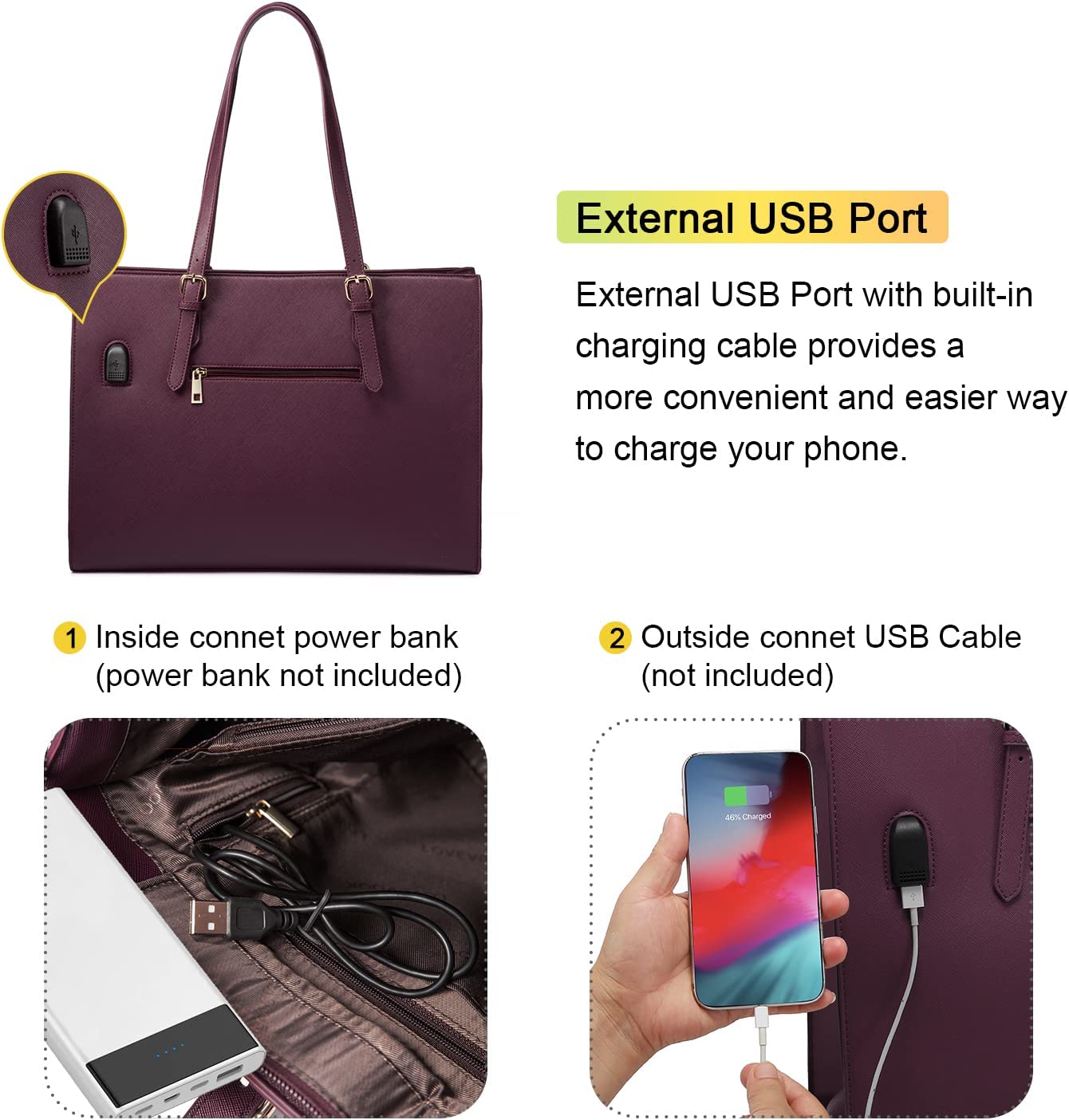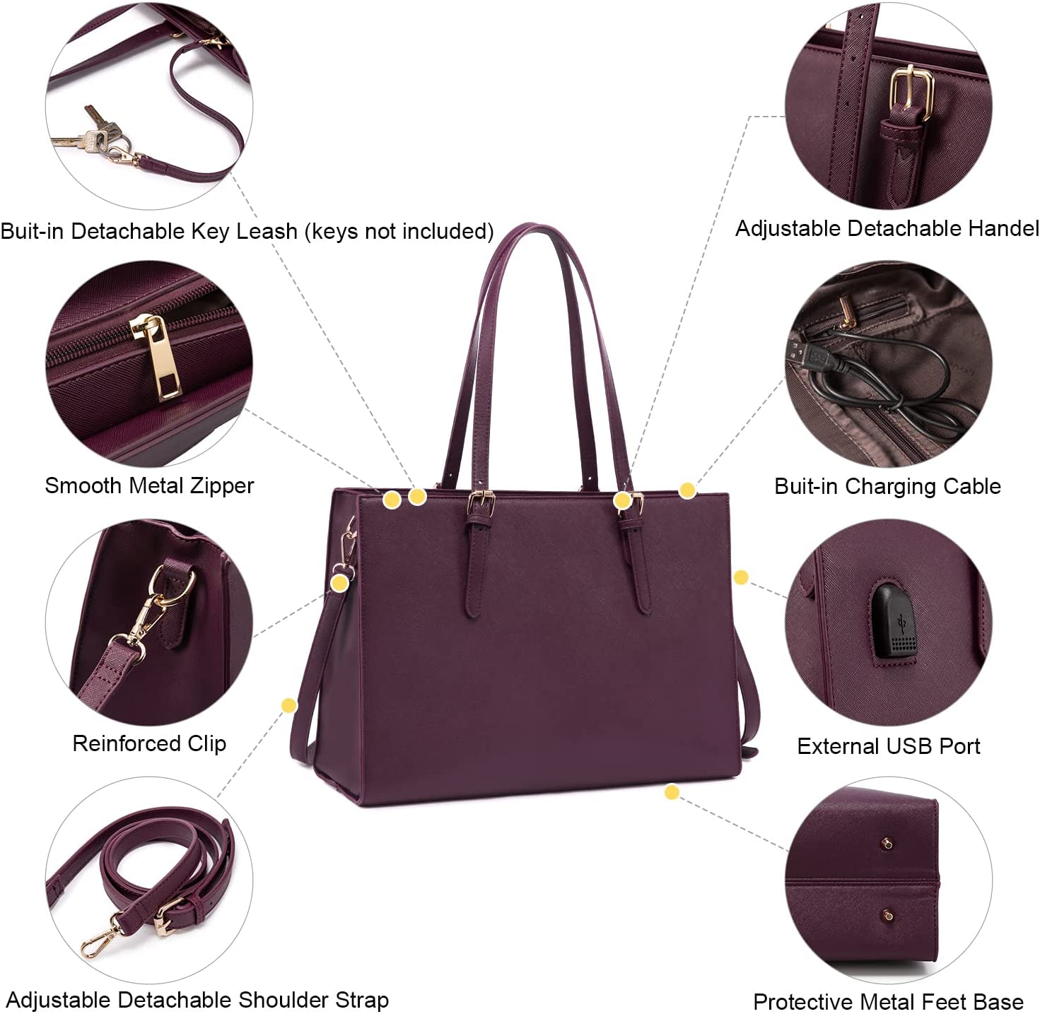 • 【Multi-pocket Design】Multiple pockets keep your belongings organized. The handbag structure consists of a 15.6-inch laptop pocket, an iPad pocket, a middle zipper pocket, an internal side zipper pocket, two large opening compartments, two small opening pockets, two pen pockets and an outer zipper pocket. And an external USB charging mouth.