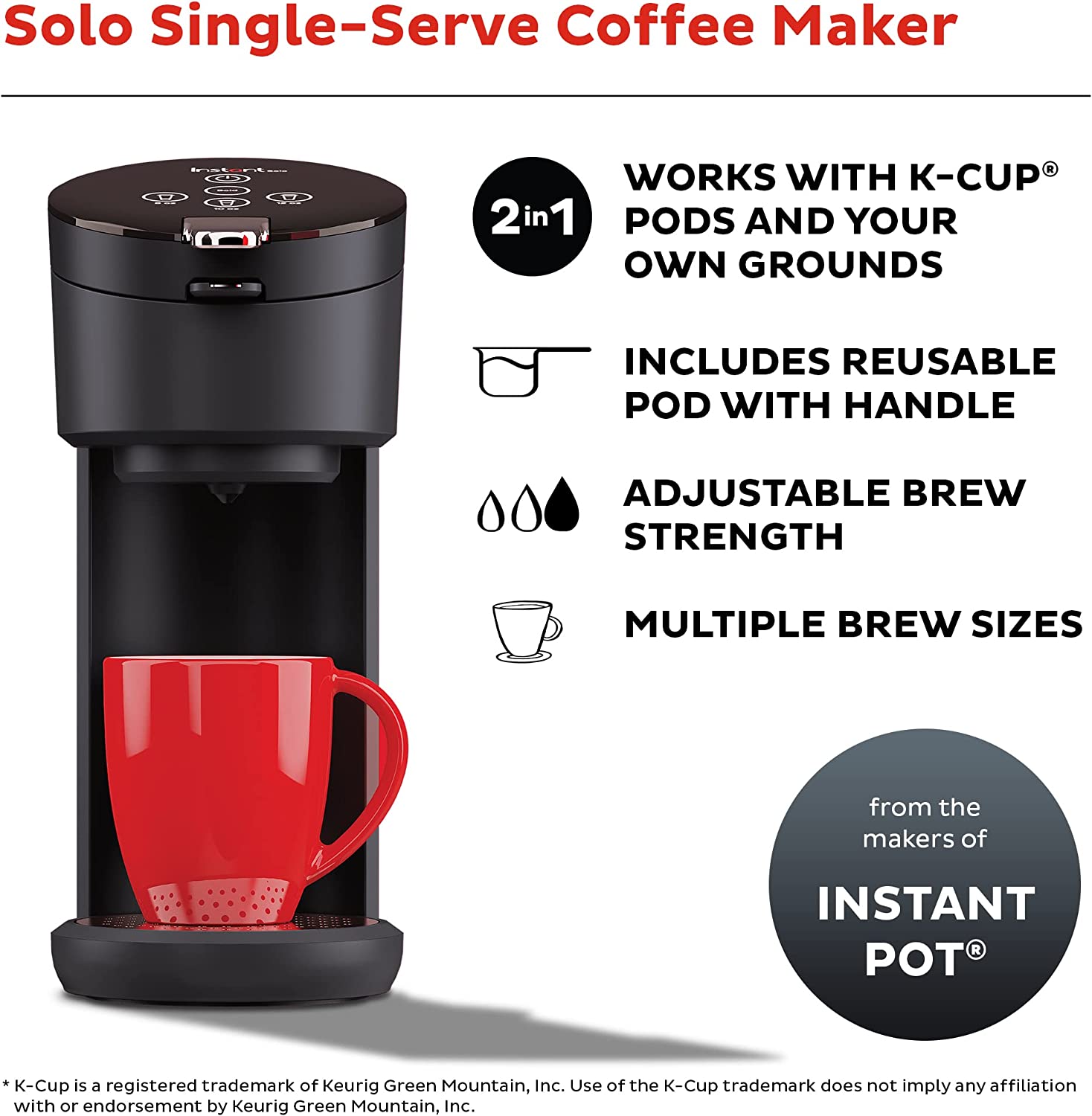 Instant Solo Single Serve Coffee Maker, From the Makers of Instant Pot, K-Cup Pod Compatible Coffee Brewer, Includes Reusable Coffee Pod & Bold Setting, Brew 8 to 12oz., 40oz. Water Reservoir, Bla