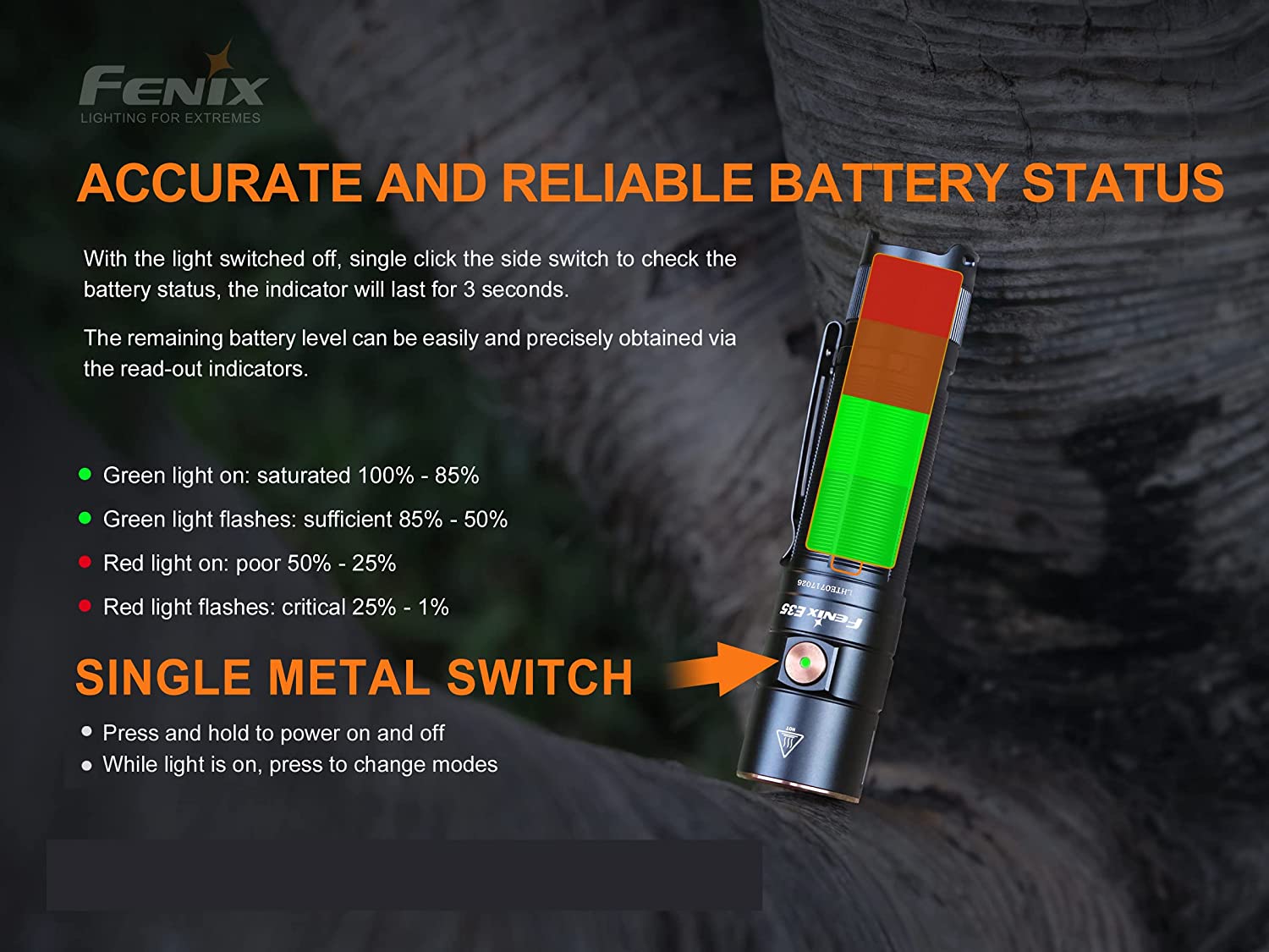 • HIGH LUMEN EDC FLASHLIGHT- Fenix E35 v3.0 pushes 3000 lumens over 262 yards in a body under 4.7 inches long. Weighing only 2oz, comfortably carry the E35 v3 in your hand or pocket, perfect for everyday use.