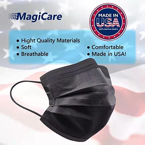 MagiCare Made in USA Masks - Black Face Masks Disposable - Premium 3 Ply Face Mask for Adults - Comfortable, Soft, Breathable - Black Face Mask American Made - 50ct Box MagiCaredeals with reliable, high-quality personal protection products. We are a Wholesaler, and Distributor in the USA of 3ply face masks, Safety Kit, Hand Gloves, Sanitizers, disinfectants, and PPE. ð½ MADE IN USA:Proudly manufactured in a state-of-the-art facility in Ontario, California. MagiCare masks are manufactured under strict quality control standards in a state-of-the-art cleanroom facility. ð· BREATHABLE & COMFORTABLE:Made from Highest Quality Material that is Extra Soft & Breathable. Wear for long periods of time without feeling suffocated by a damp, itchy fabric. Our mask's inner layer permits air and moisture to pass through, allowing for Maximum Breathability. MagiCare black disposable face masks are the Most Breathable Face Mask you'll Find! ð¡ï¸ 3 LAYER PROTECTION:Three Effective Filter Layers made of soft non-woven material for comfort and a High Filtration melt is blown middle layer for maximum 3ply protection. The inner layer is designed for comfort and to keep things Cool and Moisture Free! ð SOFT EARLOOPS:Ear Loops won't break easily VS other cheap disposable masks. Ear Loops are highly stretchable, non-latex soft elastic materials that is made to last. These USA-made masks are suitable for Men and Women and designed to fit Adults, Small or Large Faces. ðª STRONG/ BENDABLE NOSE BRIDGE:Nose Piece is a stronger, more dependable nose wire to hold shape longer and contours the shape of your face for Maximum Protection  Our some relevant products: Kids Disposable Face Masks