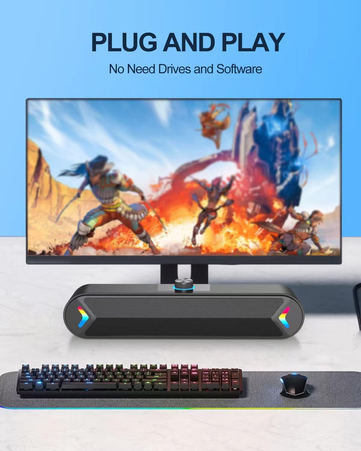 - Stereo and Noiseless:The PC speaker uses upgraded 2x5W technology to deliver the clear and crystal sound .The soundbar speaker can enhance your listening experience when you enjoying indoor movies, videos, music and games.