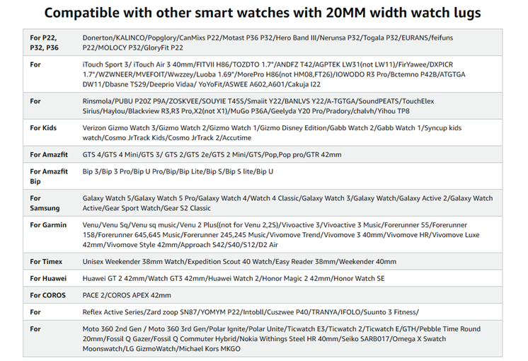 STRAP WIDTH: 20MM, COMPATIBLE WITH ALL SMART WATCHES WITH 20MM WIDTH WATCH LUGS. DON'T FIT FOR 22MM SMARTWATCH.