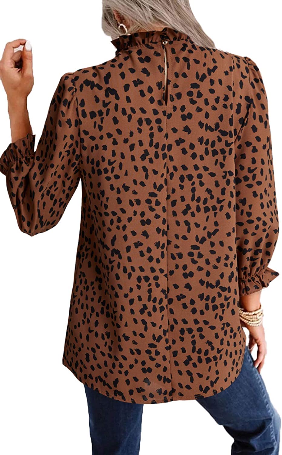 [Feature]: Elegant blouse for women feature with fashion leopard print, 3/4 sleeve with ruffle hem, ruffle neck, keyhole back, frill mock neck shirt