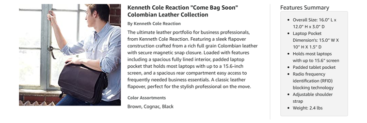 Carry your mobile office essentials comfortably and stylishly in the Kenneth Cole Reaction "Come Bag Soon" Full-Grain Colombian leather 15.6" Laptop messenger bag from the Kenneth Cole 'Manhattan' Collection. This soft, smooth, supple, and luxurious full-grain, cowhide Colombian leather bag features a classic messenger styling with contrast stitching. The rear features a magnetic snap closure for accessing frequently needed items, and its fully-lined interior boasts a padded laptop computer compartment, a padded tablet pocket, a full-length zip pocket, and plenty of room for your files. Open pockets under its flap include a cell phone pocket, an anti-theft RFID Pocket, pen sleeves, and card slots. Its open-back pocket Also offers further storage space. This Colombian leather laptop messenger bag comes with a padded, adjustable shoulder strap that extends 60 inches for your carrying comfort. Classic styling accompanies your everyday life, and all colors pair perfectly with your daily wardrobe, from work to weekends. The perfect business-savvy, Colombian leather, 15.6" Laptop messenger bag for travelers and professionals whom value both style and function. ★ Backed by a manufacturer lifetime limited warranty against defects. ★ Overall size: 16" W x 12" H x 3" D. ★ Computer Compartment Dimensions: 15" W x 10" H x 1.5" D. ★ Product Weight: 2.4 lbs. ★