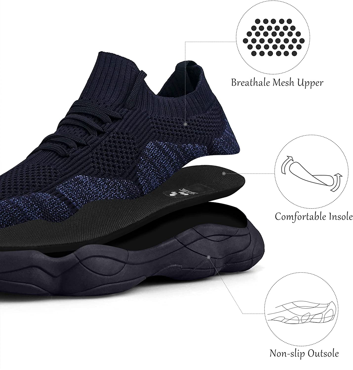 Ultra Breathable Mesh Upper - Feethit running shoes uppers are made of highly elastic woven fabric with thousands of densely ventilated holes. And the soft fabric will expand expand with the feet, maximizing the breathability and keeping the feet dry and clean.