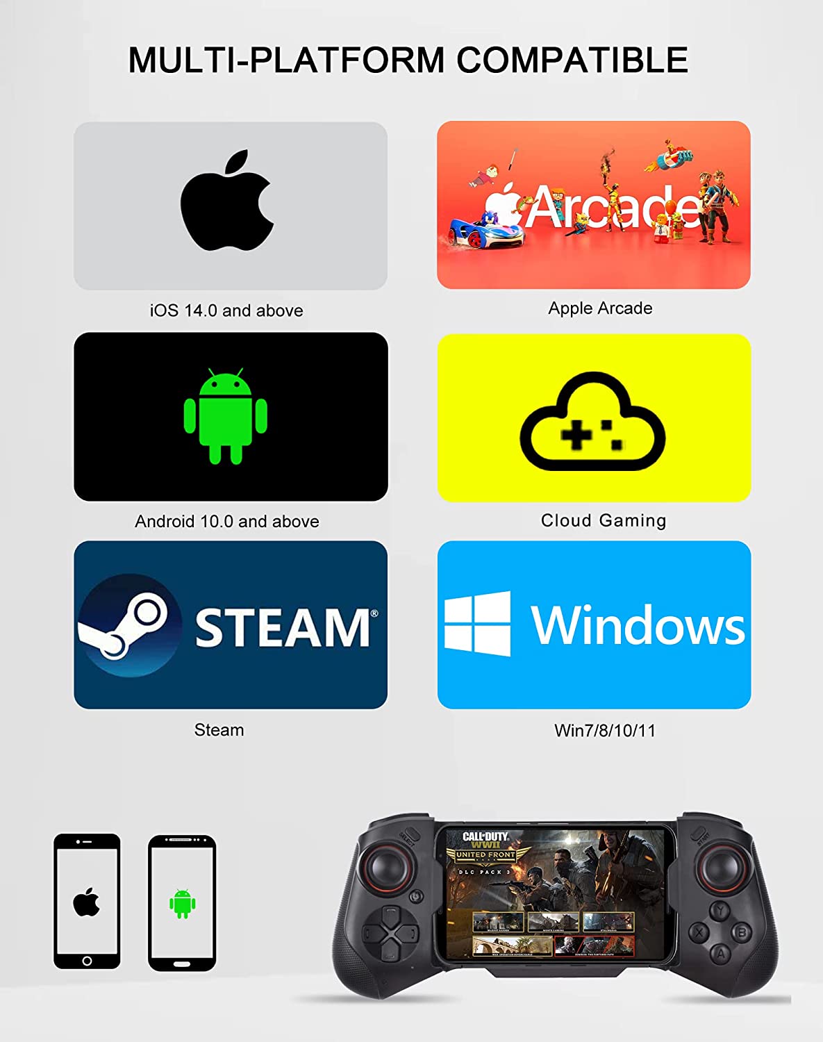 【Works for iOS 14.0+】Mobile gaming controller for any iPhones. For iPhone 14, 14 Plus, 14 Pro, 14 Pro Max, iPhone 13, iPhone 13 mini, iPhone 13 Pro, iPhone 13 Pro Max, iPhone 12, 12 Pro, 12 Pro Max, X, XR, XS, XS Max, 11 Pro, 11 Pro Max, 11, 7Plus, 8Plus and more. The gaming gamepad also works for iPad, iPad Pro and iPad Air, but the controller telescoping stand can be stretched to be compatible with up to 7.2-inch iPhones, so iPads over 7.2 inches cannot be placed on the controller stand.