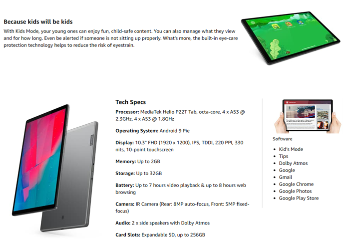 Created for everyone in the family to enjoy, the Lenovo Tab M10 Plus includes Kid's Mode with dedicated content, parental control, and specialized eye protection. The bumpy environment alert and posture alert let you know when this Android tablet isn't being used correctly.