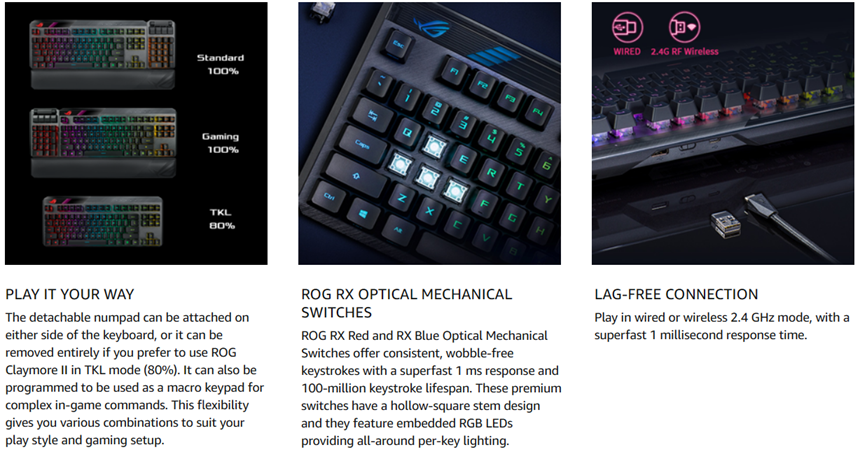 The ROG Claymore II elite gaming keyboard delivers a host of features designed to give you exciting new ways to play. Create your ideal gaming setup by placing the new detachable numpad on whichever side you prefer; then choose between wired or wireless mode and light it all up with Aura Sync. And once you’re in battle, assume full tactical control with ROG RX Optical Mechanical Switches and customizable hotkeys. The detachable numpad can be attached on either side of the keyboard, or it can be removed entirely if you prefer to use ROG Claymore II in TKL mode (80%). It can also be programmed to be used as a macro keypad for complex in-game commands. This flexibility gives you various combinations to suit your play style and gaming setup. ROG RX Red and RX Blue Optical Mechanical Switches offer consistent, wobble-free keystrokes with a superfast 1 ms response and 100-million-keystroke lifespan. These premium switches have a hollow-square stem design and they feature embedded RGB LEDs providing all-round per-key lighting. Play in wired or wireless 2.4 GHz RF mode, with a superfast 1 millisecond response time. A 4000 mAh battery and energy-efficient design give you up to 43 hours of nonstop gaming in wireless mode on a single charge, even with RGB lighting on. 30 minutes of USB-C fast charging* allows ROG Claymore II to be operated for up to 18 hours (lighting off). The fast-charge function can be switched off to use the provided USB passthrough for convenient connection to other devices. The detachable numpad includes four media control keys that can be programmed into hotkeys for convenient productivity shortcuts or macro in-game commands. There’s even a built-in control wheel for quick volume adjustment. With wireless Aura Sync RGB, the entire color spectrum and a range of dynamic lighting effects are at your command. Individually lit keys allow you to create a keyboard that’s uniquely yours. Customize and shine in your own way, wirelessly.