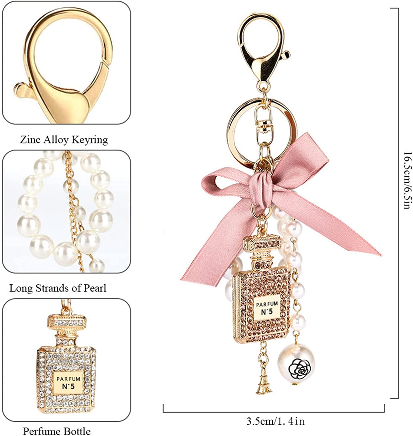FEATURES:Unique designed with PARFUM NO.5 perfume bottle with pearl strands and bowknot decor.Affordable price and beautiful looking, perfect decor for car, handbag, backpack, clothes, etc.Suitable for girls and women, giftable for your girlfriend, wife, mom, daughter, friends, etc.Ideal present for Birthday, Anniversary, Mother's Day, Christmas, Thanksgiving, and so on.
