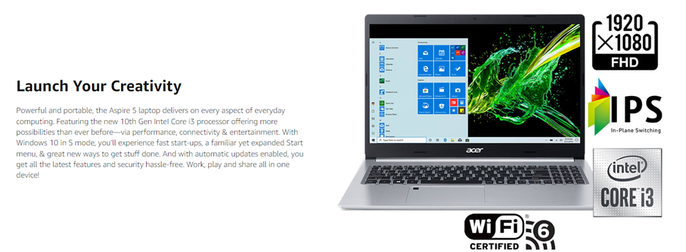 Acer Aspire 5 A515-55-35SE comes with these high level specs: 10th Generation Intel Core i3-1005G1 Processor 1.2GHz with Turbo Boost Technology up to 3.4GHz (4MB Smart cache), 15.6" Full HD (1920 x 1080) widescreen LED-backlit IPS Display, Intel UHD Graphics, 4GB DDR4 On-Board Memory, 128GB NVMe SSD, 1 - Available Hard Drive Bay, True Harmony Gen 2 Technology, Two Built-in Stereo Speakers, Acer Purified.Voice Technology with Two Built-in Microphones, Intel Wireless Wi-Fi 6 AX201 802.11ax Dual-Band 2.4GHz and 5GHz featuring 2x2 MU-MIMO technology (Max Speed up to 2.4Gbps), 10/100/1000 Gigabit Ethernet LAN (RJ-45 port), Bluetooth 5.0, Back-lit Keyboard, Acer Fingerprint Reader supporting Windows Hello, HD Webcam (1280 x 720), 1 - USB 3.1 (Type-C) Gen 1 port (up to 5 Gbps), 2 - USB 3.1 Gen 1 Port (one with Power-off Charging), 1 - USB 2.0 Port, 1 - HDMI Port with HDCP support, Lithium-Ion Battery, Up to 8-hours Battery Life, Windows 10 Home (S mode), 3.97 lbs. | 1.8 kg (system unit only) (NX.HSPAA.00A)