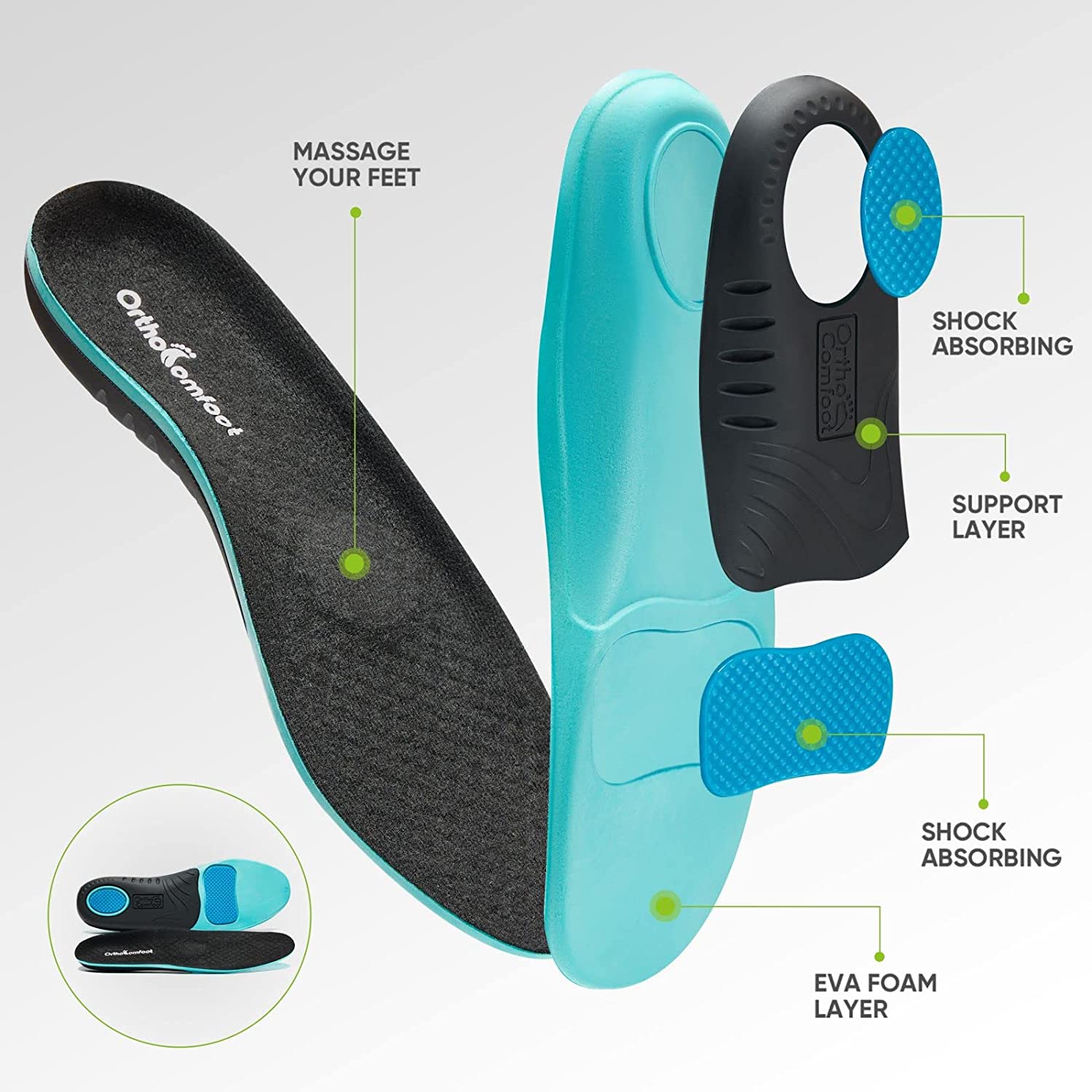 • ★WHAT YOU GET?Planters fasciitis support | Corrected posture | Longer walks, running or workouts | Muscle fatigue relief | Joints relaxation | Spinal stress relief | Extra cushioning in forefoot, metatarsal and heel region.OrthoComfoot shoe insoles provide plantar fasciitis - high arch - flat feet - heel spurs - metatarsalgia - shin splints - bunions - Morton's neuroma - achilles tendonitis - diabetic - overpronation - pregnancy - ball of foot pain - hip pain support and pain relief.