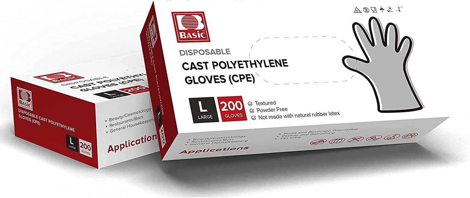 Cast Polyethylene (CPE) Glove Type: Cast Polyethylene Glove, Powder-Free, Non-sterile Material: Polyethylene Resin Colour: Clear Design & Features: Ambidextrous, embossed Functional Benefits: Safe to use in contact with food Good fit on hand and fingertips Green technology and environmentally friendly Free from latex protein and powder-free Comfort while wearing and firm grip when holding smooth objects