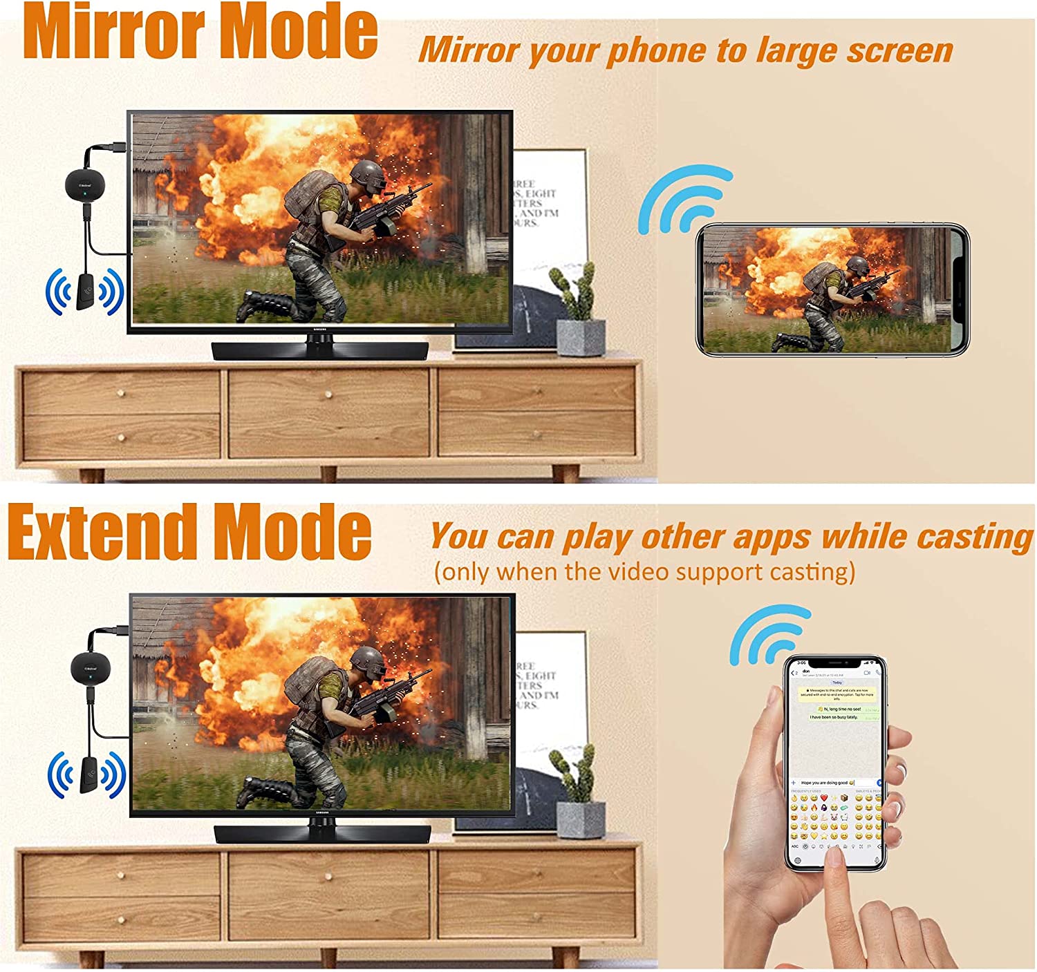 • ❤️【Mirror & Extend Mode】HDMI display dongle supports Mirror and Extend Modes. Mirror Mode: The HDMI Wireless Dongle adapter enables to mirroring of videos, games, music, photos, and files from the phone, pad, or laptop to TV/projectors /monitors. Great for home entertainment/ business/ educations/ training. Extend Mode: While casting video, you can still use other apps on your phone. ( Note: only when your video support cast mode).