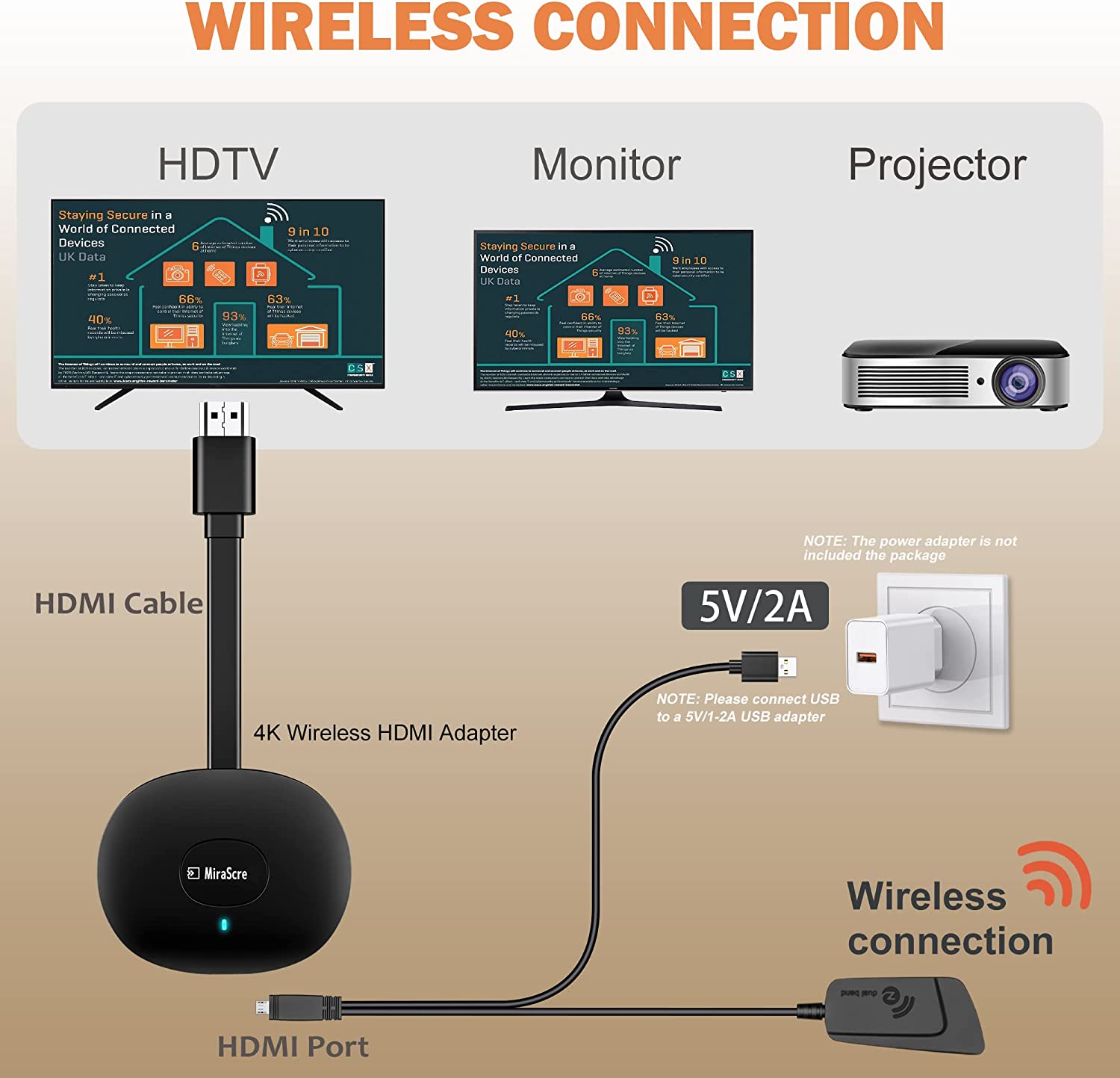 4K Wireless HDMI Display Dongle, TIMBOOTECH Miracast Adapter Streaming YouTube Video/Audio Receiver for iPhone/iPad/iOS/Android/Mac/Laptop/PC to TV/Projector/Monitor - Miracast, DLNA, Airplay, Chrome