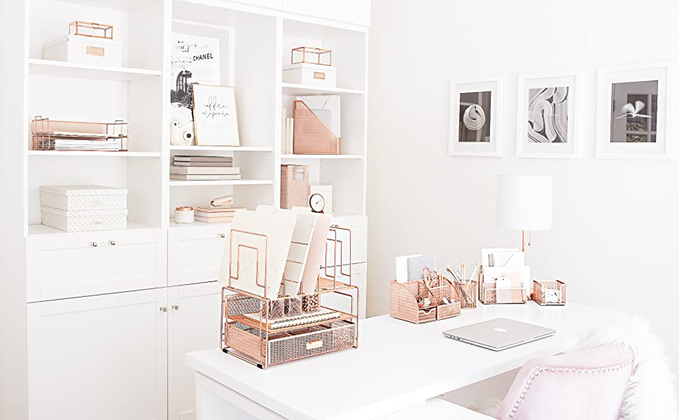 - MODERN, SPACE SAVING DESIGN: Organization does not have to be difficult. Made of metal finished in rose gold and featuring a unique mesh design, this Vertical and Horizontal File and supplies organizer with drawer and letter sorter keeps things organized and saves space.
