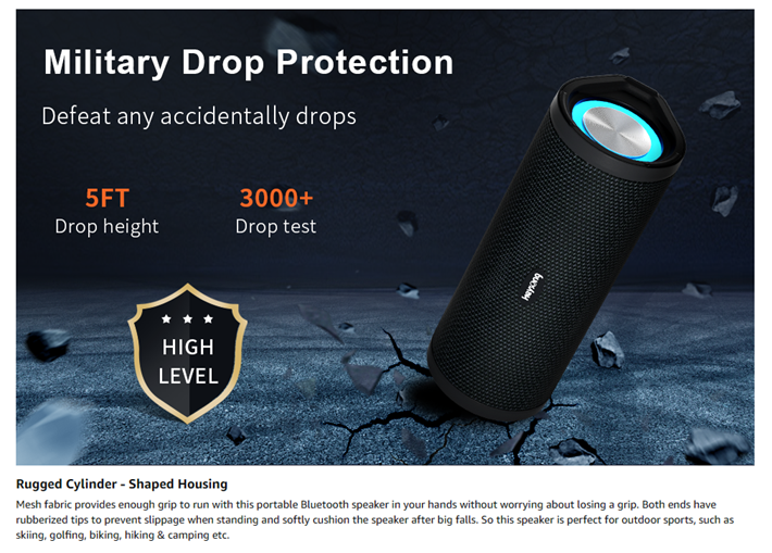 - [ Powerful IPX7 Waterproof Speaker ]: Take your music anywhere, even in the water! The HEYSONG waterproof Bluetooth speaker is fully sealed and can be immersed in up to 1 meter of water for up to 30 minutes. The water vapor in bathroom will never interfere with the sound quality of the waterproof speaker. It's resistant to rain, dust, snow, sand, mud and spills, No worries about weather, a great Bluetooth speaker for Shower, Pool, Beach, Swimming, Surfing, Water Parks, Kayaking, Home, Travel.