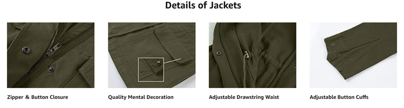 • Functionality: Center front hidden zipper paired with snap buttons, four flap pockets for ample storage,adjustable button cuffs for comfortable fit.