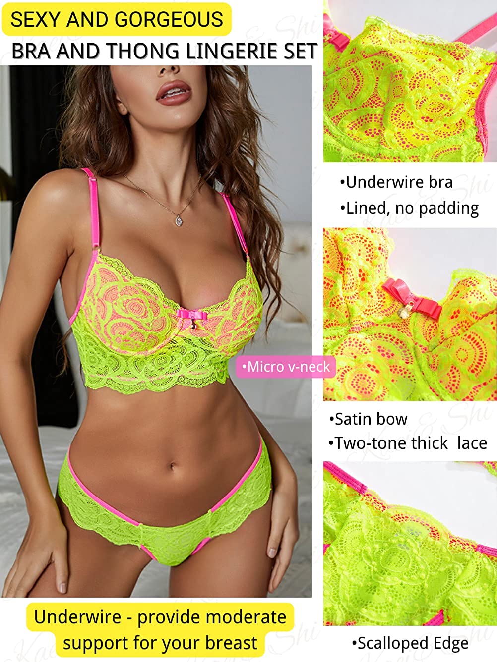 • ✿Feature: This matching bra and panty set is featured with fluorescent, two tone, bow detail, spaghetti strap, scalloped trim which shows your curve beautifully.