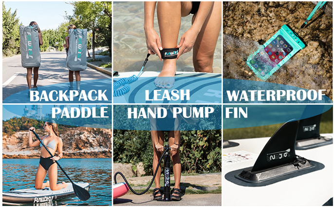 - The above accessories will be included in the package you receive:Adjustable aluminum paddle, high pressure pump, travel backpack, coil leash,waterproof bag, and 3 removable fins.