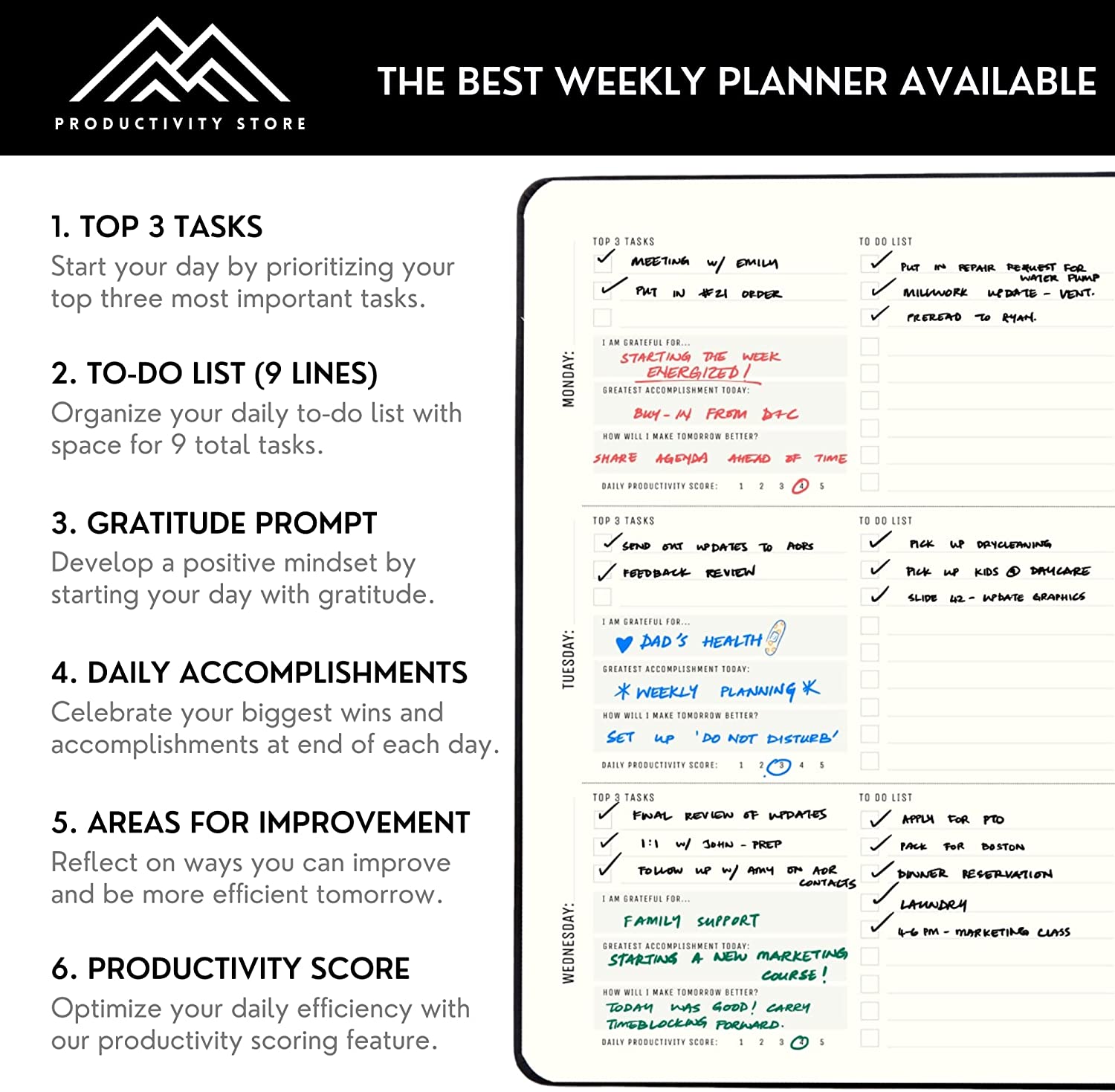 ✅ DAILY PLANNER “TOP 3” WITH GRATITUDE PROMPTS: Start each day with the daily “TOP 3” highest-priority tasks, longer to-do list, daily gratitude prompts and more. Increase happiness, improve relationships, and develop a positive mindset while crushing your goals.