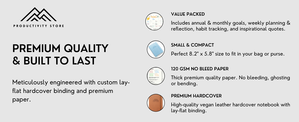 ✅ SAY HELLO TO THE PLANNER THAT WILL CHANGE YOUR LIFE: Crush your personal and professional goals with Productivity Store’s flagship planner. Get that promotion, start that business or break that bad habit. Evidence-based layouts that increase goal-setting success, happiness and work-life balance.